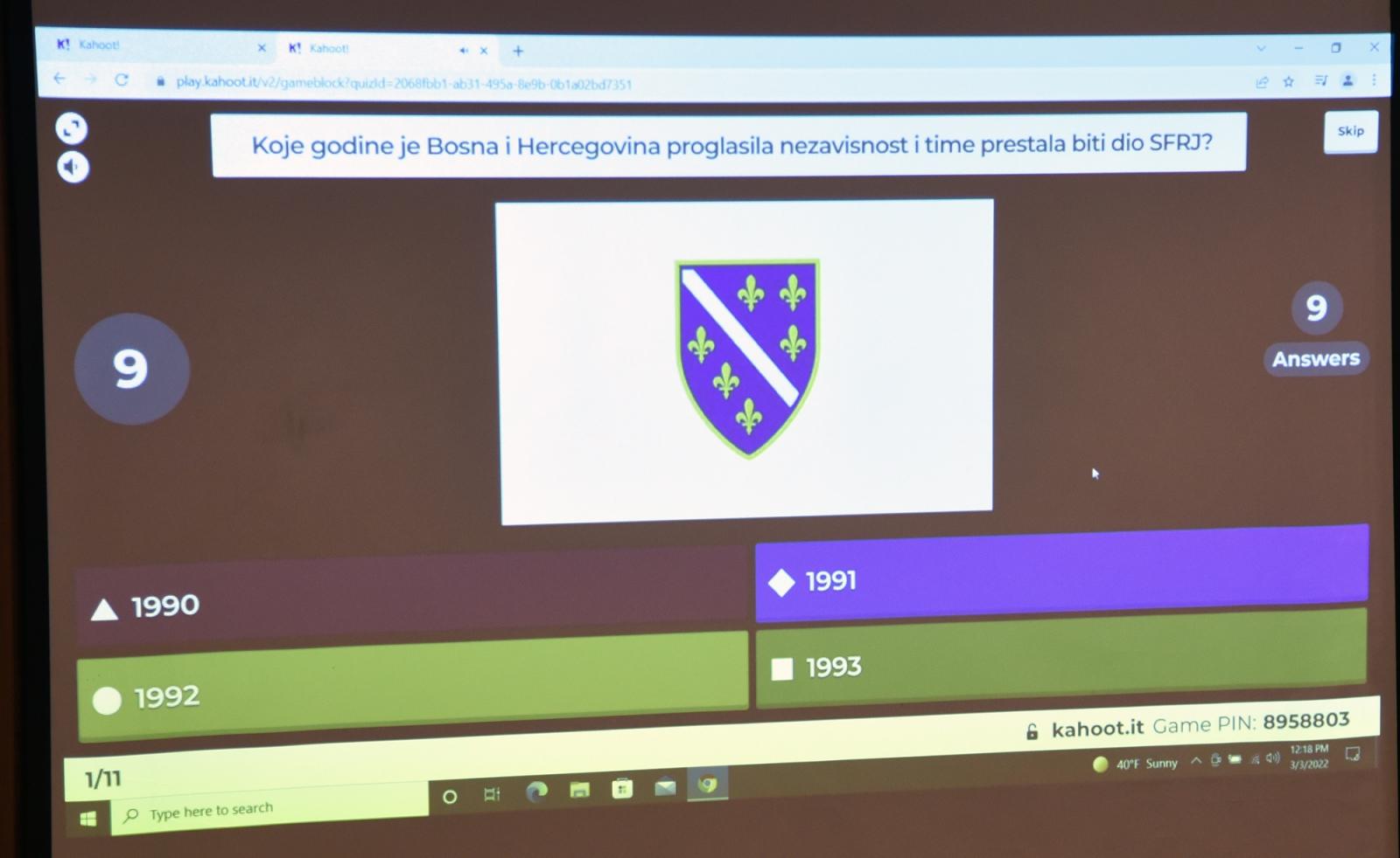 Centar za studente i razvoj karijere (SCC) na Internacionalnom univerzitetu u Sarajevu (IUS) organizovao je 3. marta 2022. godine kviz o historiji BiH povodom obilježavanja Dana nezavisnosti Bosne i Hercegovine. Učenici su se uključili u ovu zabavnu aktivnost koja je realizovana putem popularne platforme za kviz Kahoot.it. Student studijskog programa Softverski inženjering, Mahmud Hrnjić je uspješno odgovorio na sva pitanja i time osvojio prvo mjesto. Drugo mjesto osvojila je Jasmina Jubović, studentica smjera Međunarodni odnosi na IUS-u. Veliko hvala organizatorima događaja i svim učesnicima.