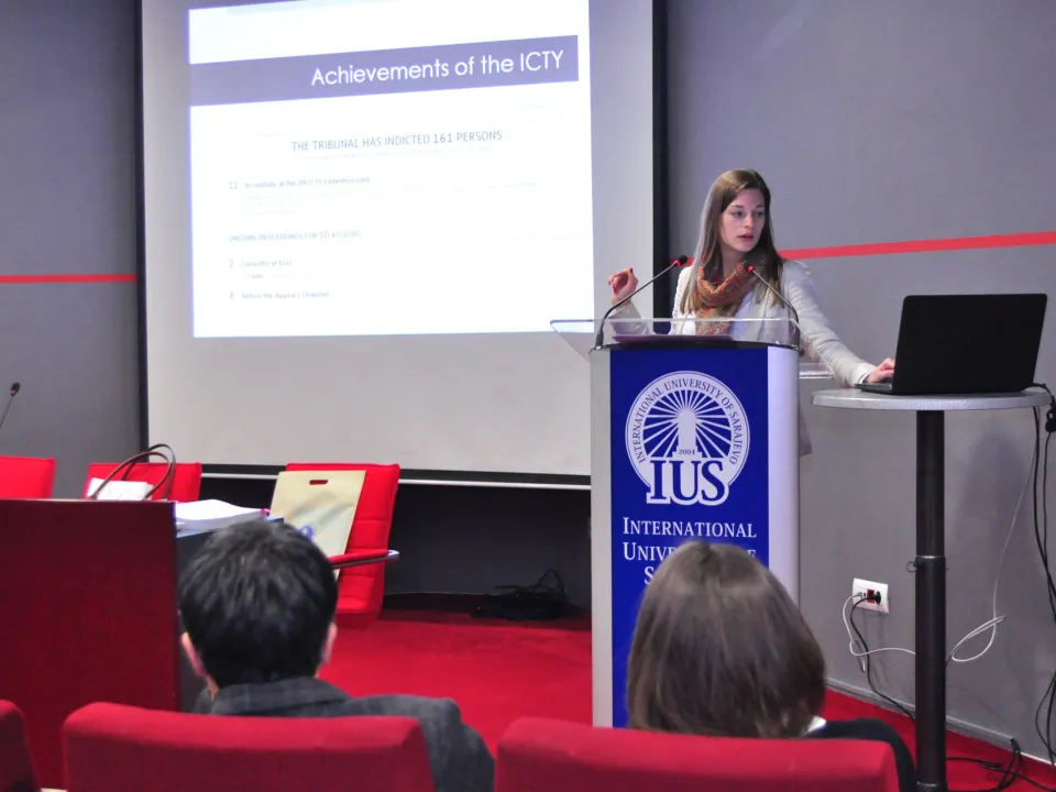 Lauranne Duffaut, pravni stručnjak pri Žalbenom vijeću Međunarodnog suda za ratne zločine počinjene na području bivše Jugoslavije održala je predavanje na temu “Praksa Međunarodnog suda za ratne zločine na području bivše Jugoslavije u razrješavanju genocida i zločina protiv čovječnosti” u glavnom amfiteatru IUS-a u četvrtak, 28. aprila 2016. godine.