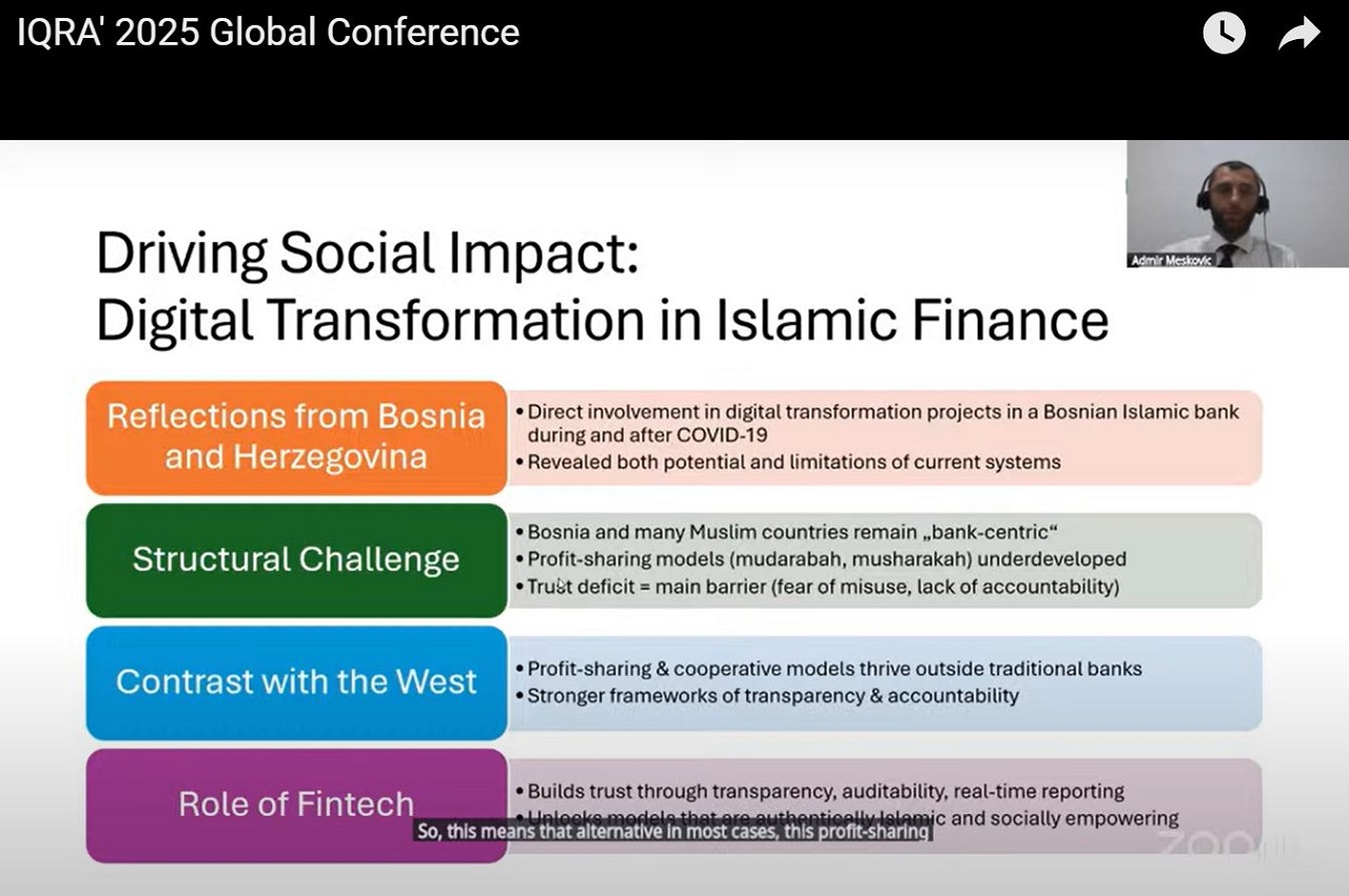 U nastavku su uslijedila izlaganja i diskusije o izazovima i prilikama ekonomskog osnaživanja u muslimanskim društvima. Dr. Admir Mešković (IUS, BiH) održao je prezentaciju „Pokretanje društvenog utjecaja: Digitalna transformacija u islamskim finansijama”, ističući potencijal digitalnih rješenja u jačanju transparentnosti, prevazilaženju nedostatka povjerenja i razvijanju modela podjele dobiti izvan tradicionalnih bankarskih okvira.