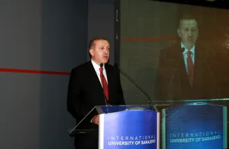 Prime Minister of Republic of Turkey Recep Tayyip Erdoğan addressed the present guests and students and expressed his pleasure to be in Sarajevo. He started his speech with the words from the song “Sarajevo” of the famous Bosnian singer Dino Merlin – “Sarayevo güzel sehir; sensin benim ben senin; u tebi su i kad nisu; tvoji sinovi”. Continuing his speech, Prime Minister stated that, in a short time, International University of Sarajevo became a respectable world university and thanked all those who helped the development of this university. He also expressed his thoughts on the future of the University. “Take a look at the Old Bridge in Mostar, bridge in Konjic; those are the bridges that for hundreds of years were the bridges of friendship, bridges that connected people. I believe that, in a same way, International University of Sarajevo will be the bridge of friendship and peace in the next hundreds of years” said Prime Minister Erdoğan.