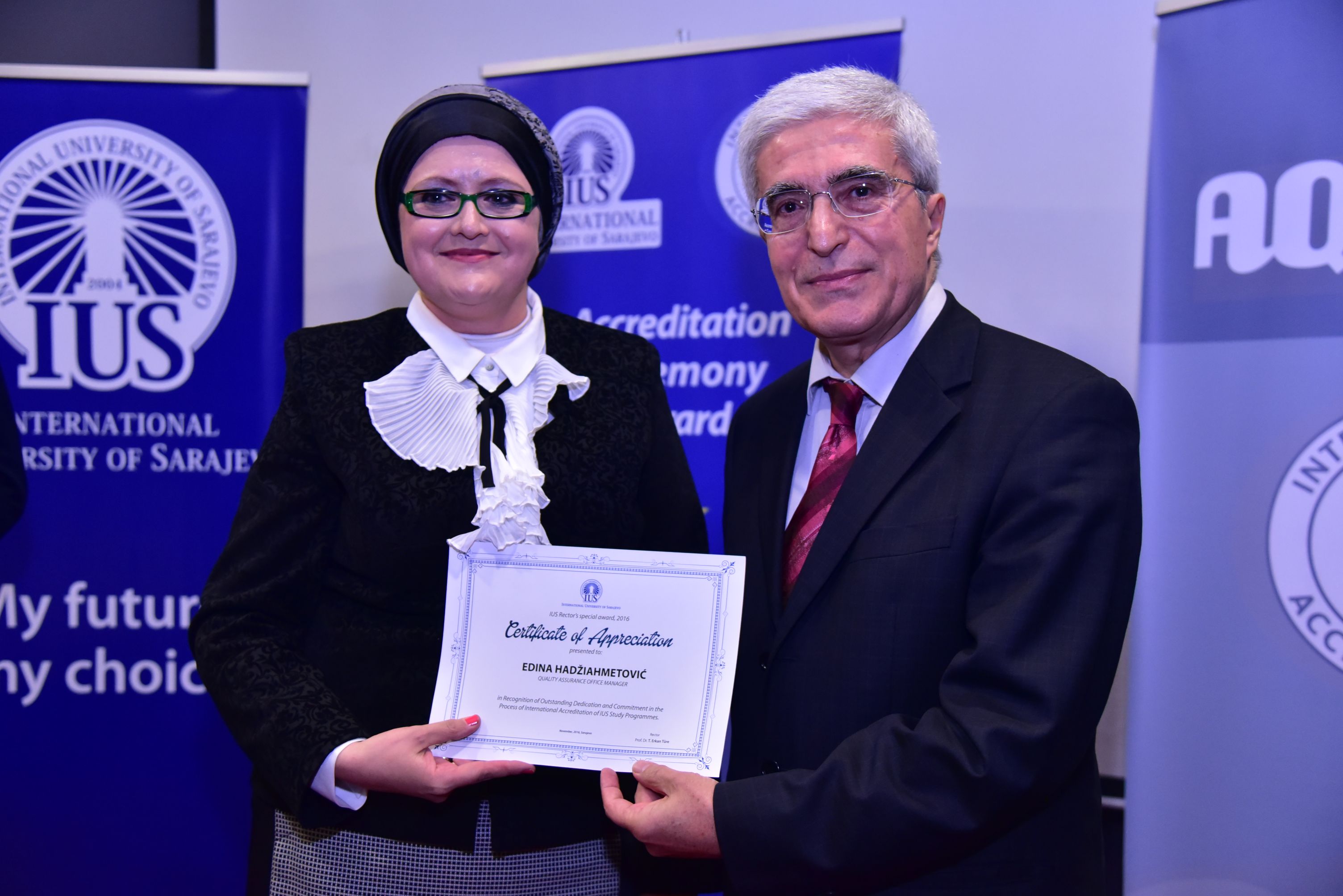 IUS Rector Prof. Dr. Tahsin Erkan Türe gave special award ‘‘Certificate of Appreciation in Recognition of Outstanding Dedication and Commitment ’’ to Assoc. Prof. Dr. Mirsad Karić, Vice Rector for General Affairs, MA Edina Hadžiahmetović, Quality Assurance Manager, and thanked them for their contribution to our university.