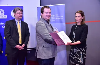 After the announcement of accredited study programs, respective program coordinators Assoc. Prof. Dr. Izudin Džafić, Faculty of Engineering and Natural Sciences, Assoc. Prof. Dr. Mohamed Ragab Abdel Gawwad, Faculty of Engineering and Natural Sciences, Assist. Prof. Dr. Peter Plenta, Faculty of Business and Administration, Assist. Prof. Dr. Anela Hasanagić, Faculty of Arts and Social Sciences were awarded certificates.
