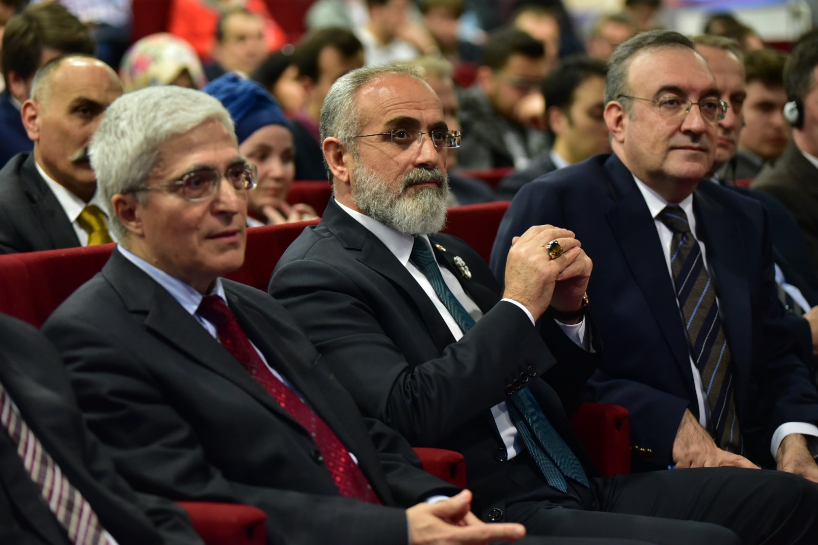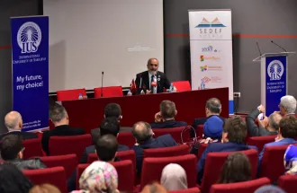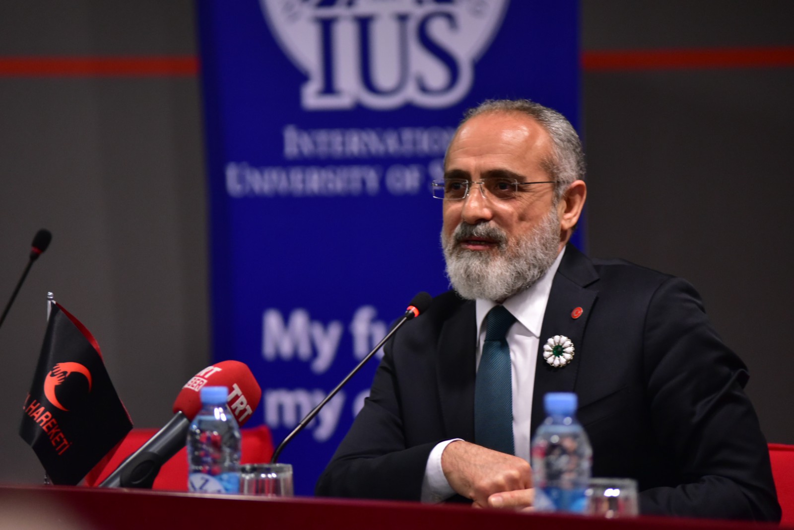 After the meeting, Mr. Yalçın Topçu, H.E. Haldun Koç, Prof. Dr. Tahsin Erkan Türe and the delegation headed to IUS Amphitheatre, where Rector Türe and the Ambassador addressed the auditorium, which included a great number of IUS students and outside guests. After the opening speeches, Mr. Topçu delivered a lecture: “The History of Turkish Democracy and Coups”.