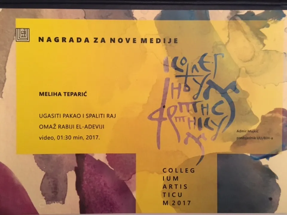 On the occasion of the April 6th, Liberation day of the city of Sarajevo, Association of Artists of BiH (ULUBIH), The Association of Applied Arts Artists and Designers (ULUPUBIH) and Association of Architects of BiH (AABIH) organizes annual-based exhibition in gallery Collegium Artisticum. This year, Assoc. Prof. Dr. Meliha Teparić of the International University of Sarajevo received an award for art work in the New media category. In the exhibition, Dr. Teparić presented video work. IUS former student Haris Heljo edited video for this occasion. This selective exhibition presents recent works of fine arts artists in Bosnia and Herzegovina which were made in the previous year. This exhibition is open for visitors until April 25, 2017, in art gallery Collegium Artisticum.