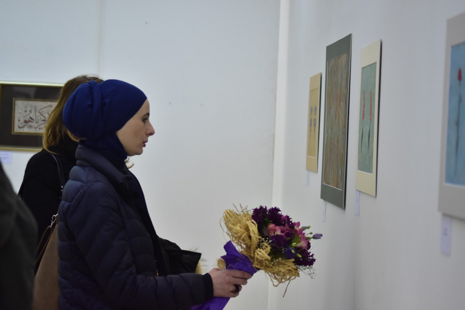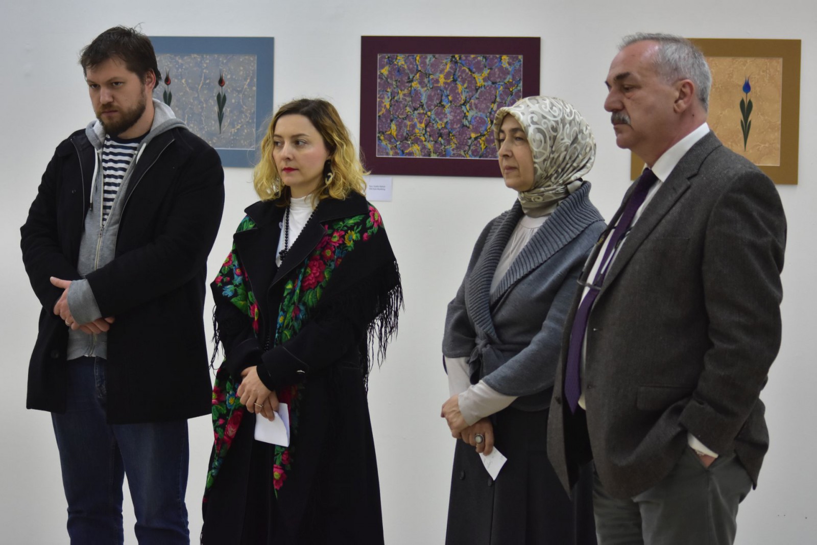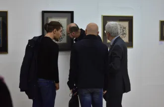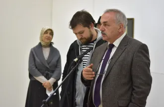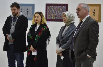 International University of Sarajevo in cooperation with the International Festival Sarajevska zima 2017 organized the exhibition of Ebru works of Mrs. Nihal Türe, master of Ebru. Special guest, Professor Alparslan Babaoğlu, arrived from Istanbul to open the exhibition “An Infinite Array of Colours: Traditional Turkish Marbling” in Collegium Artisticum on March 10, 2017. The exhibition was organized by academics and students of Department of Arts of IUS. Design of the poster and promo identity was done by M. Furkan Hızır, expert in practice. Visual identity, brochure was prepared and set up was curated by Assoc. Prof. Dr. Meliha Teparić, selector of the Visual Arts Program of Sarajevo Winter. The exhibition was attended by the IUS Rector Prof. Dr. Tahsin Erkan Türe, General Secretary Armin Kerić, Dean of FASS Assoc. Prof. Dr. Mustafa Bal, a number of academics of IUS and students of the VACD program.