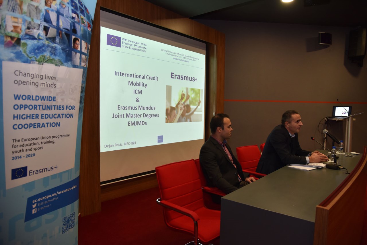 On December 4, 2019, the Erasmus+ Info Day at IUS took place. The Erasmus+ Info Day represents one event in the series of events that have been organized by Nadja Beglerovic M.Ed/MA, a Project Manager at the Office of Sponsored Projects (OSP). Mr. Suad Muhibic, Head of the National Erasmus+ Office in Bosnia and Herzegovina and Mr. Dejan Rosic, Project Officer visited our university and presented different components of the Erasmus + Program, which included Capacity Building in Higher Education projects, Jean Monnet Activities/Projects, International Credit Mobility and Joint Master Degrees.