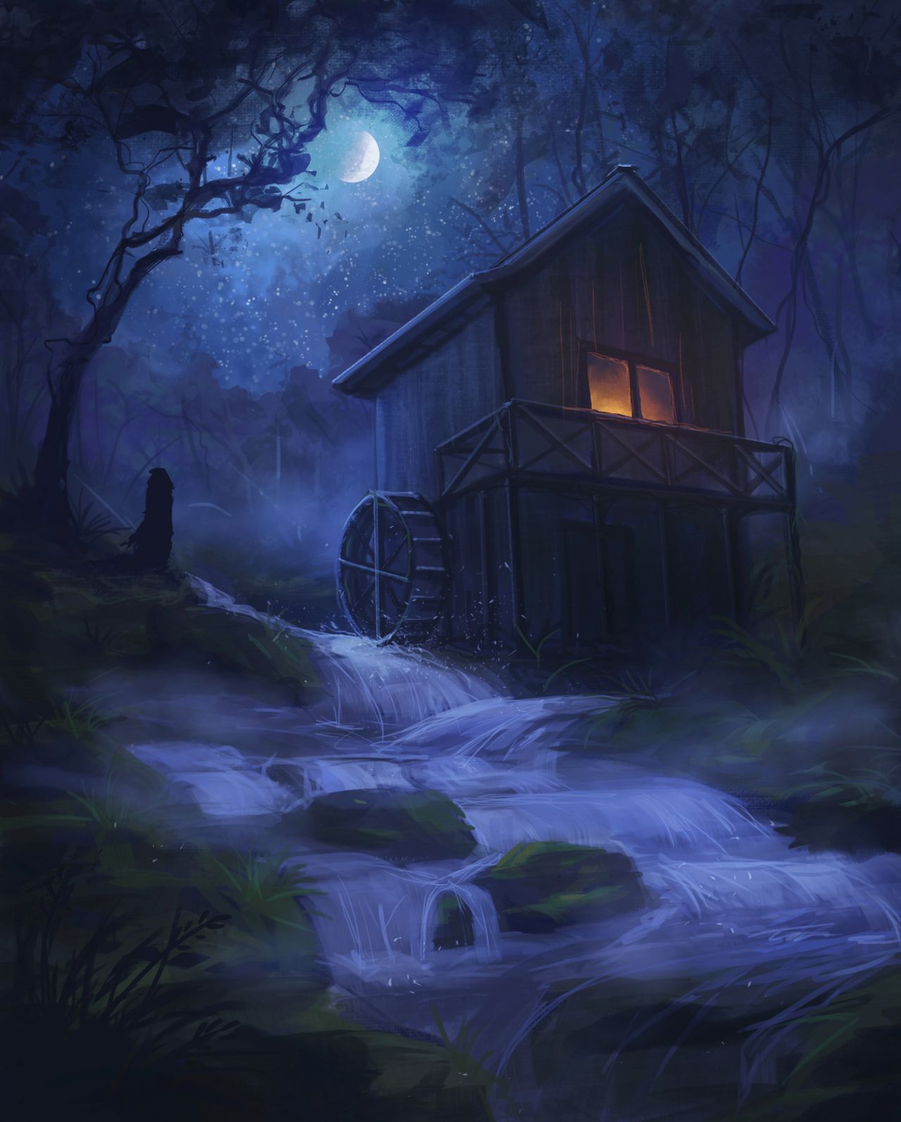 I decided to represent a very old watermill, isolated and located in a deep, dark forest. My intention was to create a mysterious, mystical atmosphere in the artwork, yet eye-catching enough to make the viewer want to further interpret it. The fog in the foreground is in a blurry-like effect introducing the focal point of the artwork – the watermill itself as well as the figure next to it. To add a bit of mysterious light and wonder, I included the moon in the background, casting its „bluish“ light onto the moody, gloomy setting.