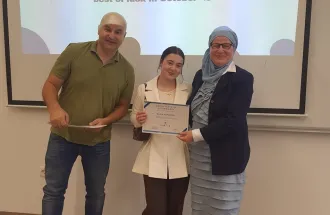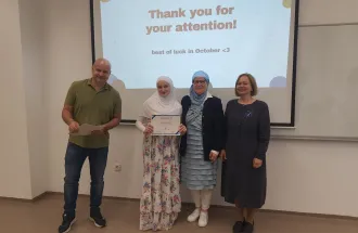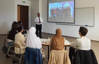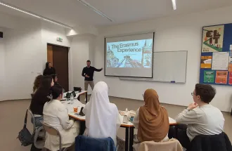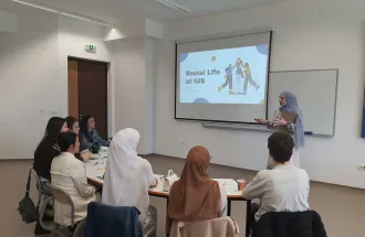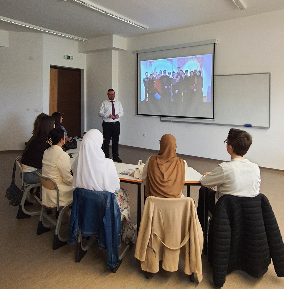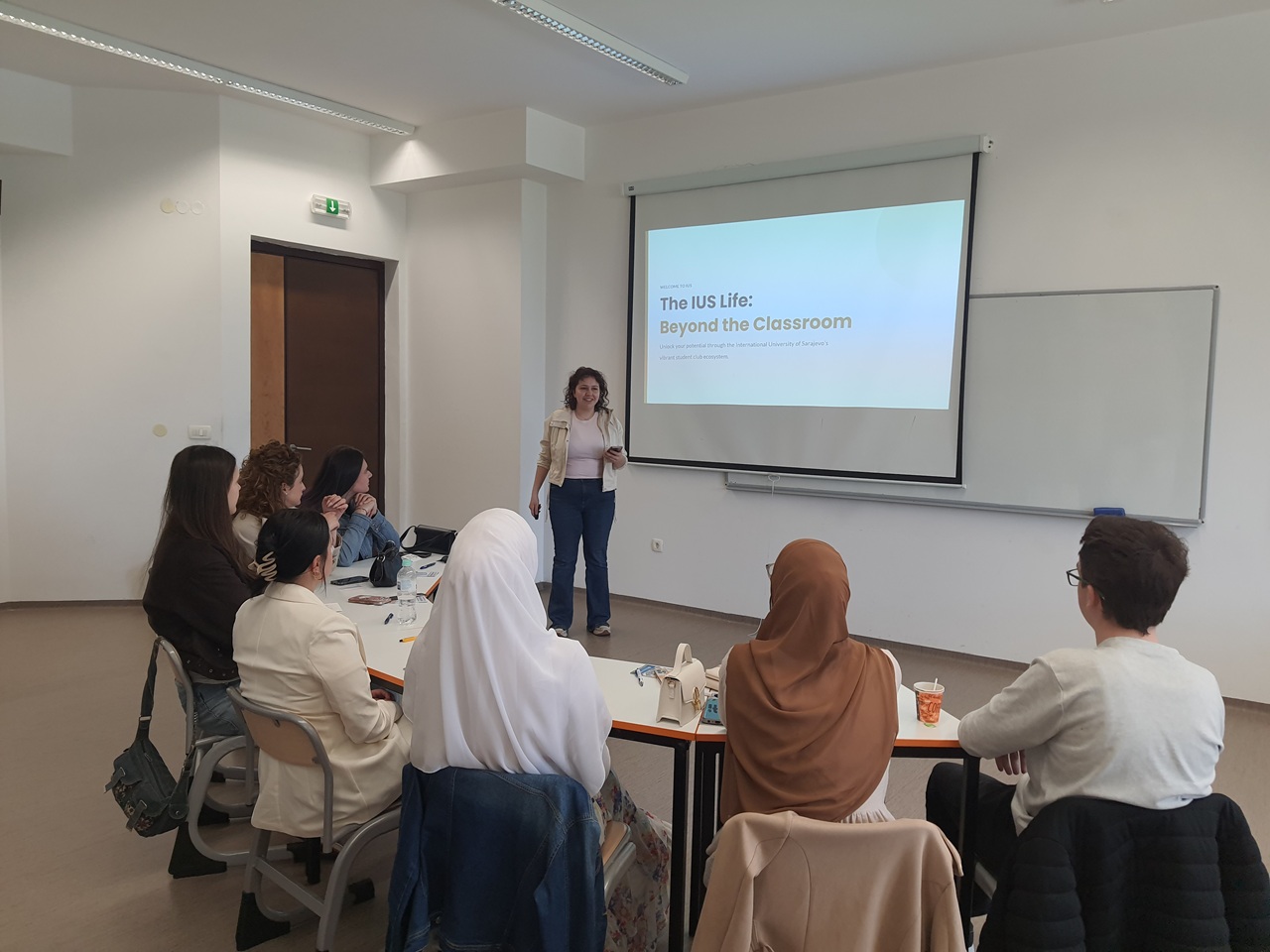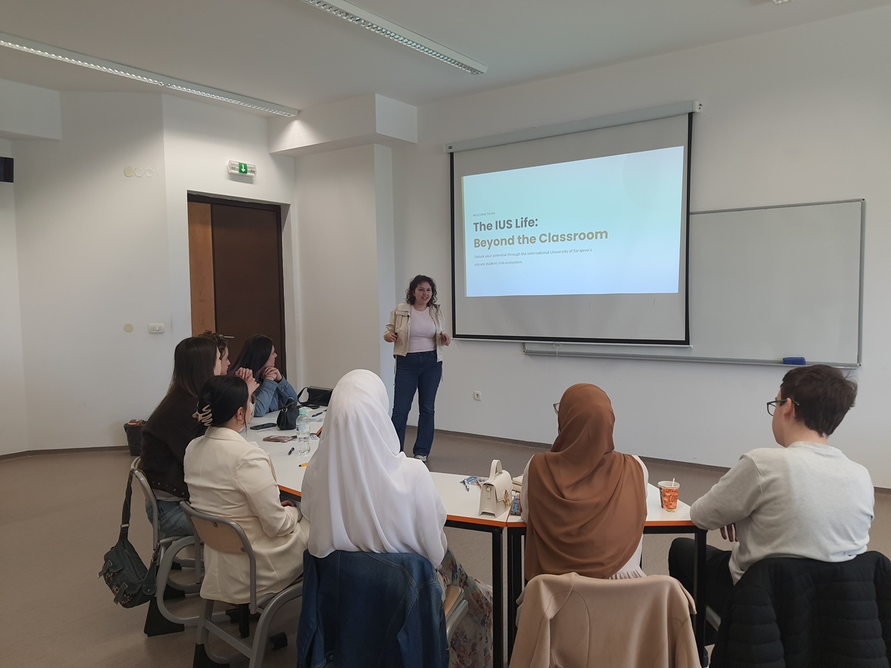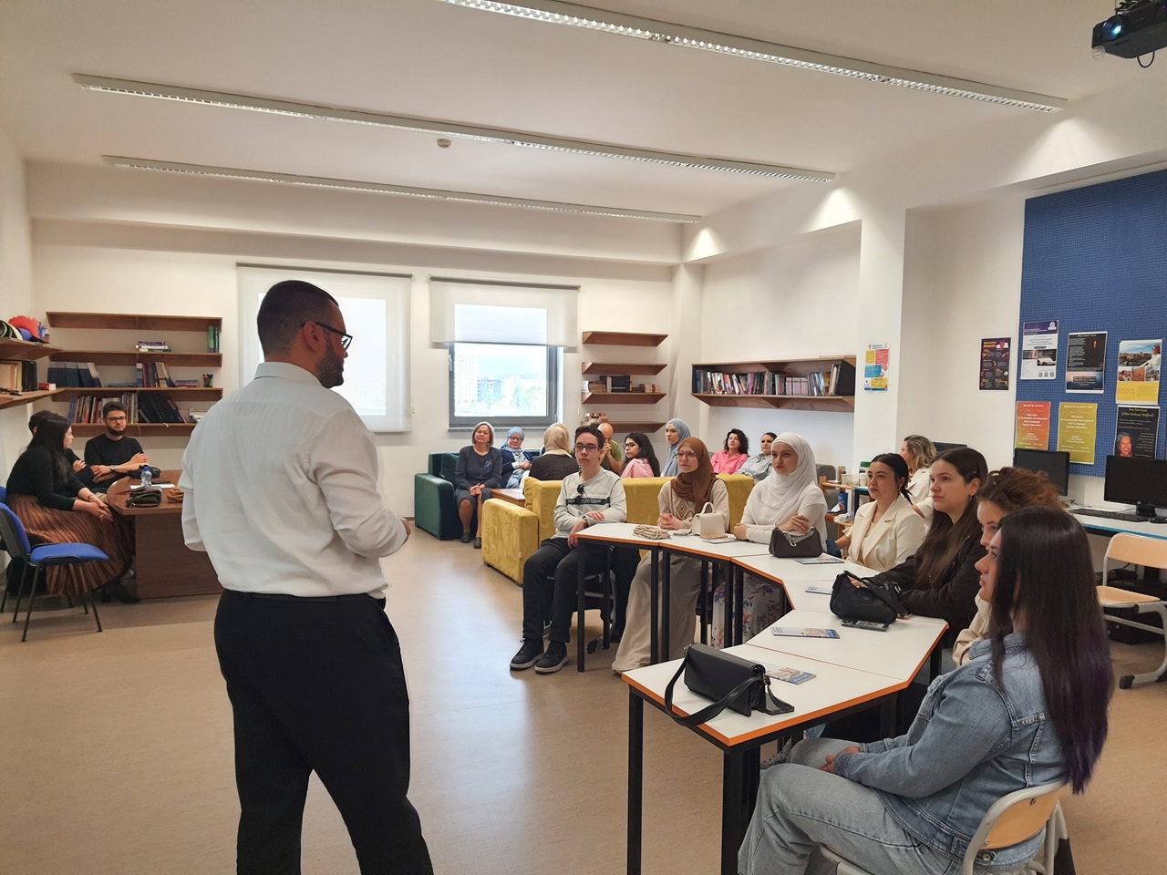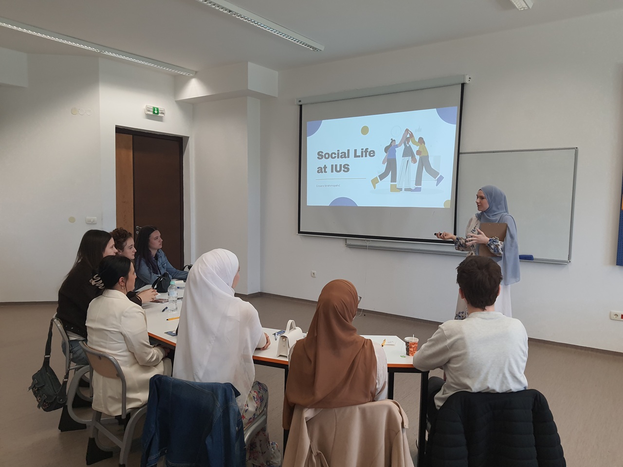The program continued with a series of student presentations that offered authentic and inspiring perspectives on academic and extracurricular life at IUS. Dino Ćosićkić spoke about his experiences during his BA and MA studies, reflecting on his academic development. Bakir Abaspahić and Lejla Vatrić presented their Erasmus exchange experiences, while Hadil About El-Ardat discussed student involvement in conferences and academic writing. Humeyra Küpeli introduced extracurricular opportunities through her presentation on the Music Club, and Ensara Ibrahimspahić shared everyday insights into student life, giving participants a closer look at the dynamic and welcoming IUS experience.