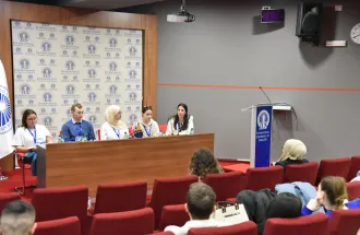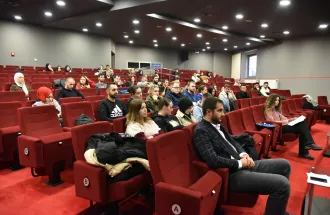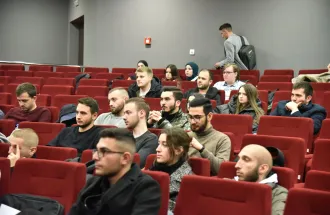 Five students: Ms. Roberta D’Agostino, Ms. Maria Perojević, Ms. Nedžma Latić, Mr. Muhammet Said Kuçuk and Ms. Coline Melanie Laurance Linquette held a panel where they discussed their own topics. Roberta’s focus was on how student exchange programs are a form of soft power while Maria and Nedžma discussed how the European and national identities are portrayed through the Erasmus experience. Muhammet Said began the talk on how Erasmus exchange program stands between the East and the West and it served as an introduction to Coline Linquette, our current incoming student from the Catholic University of Lille who focused on her personal shift and compared her perspectives on Bosnia and Herzegovina, Bosnian people and Islam she had had before her arrival to the current ones, six months later. Amazed by the warmth of the people she has met so far, she confirmed that she will go back to France as a totally different person feeling thankful for this extraordinary experience.