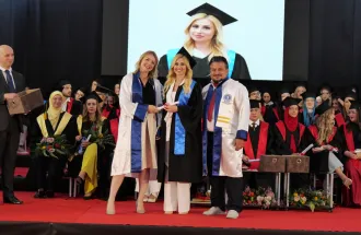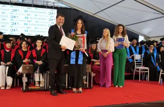The best undergraduate students of the Class of 2024 are Nermana Ferhatbegović, Visual Arts and Visual Communications Design (VACD) at the Faculty of Arts and Social Sciences (FASS); Sara Prlja, International Business and Finance at the Faculty of Business and Administration (FBA); Ajlin Humkić, Faculty of Law; and Florina Abazi, Genetics and Bioengineering (GBE) at the Faculty of Engineering and Natural Sciences (FENS). The students were awarded valuable gifts for their exceptional results and achievements.