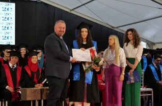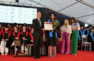 The Valedictorian of the Class of 2024 is Florina Abazi, who graduated from the Genetics and Bioengineering (GBE) study program at the Faculty of Engineering and Natural Sciences (FENS). She addressed the audience and thanked IUS and the SEDEF Foundation for creating such an environment where she was not afraid to ask questions and was always inspired to do her best in everything she did. Ms. Abazi particularly thanked her GBE professors, who always supported her to aim high and gave her opportunities to improve her skills and abilities in various fields of study.