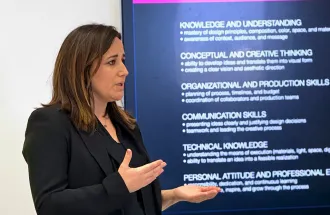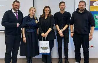 The Visual Arts and Visual Communications Design (VACD), English Language and Literature (ELIT) and English Language and Literature, Teaching (ELT) study programs jointly hosted an inspiring guest lecture by Ms. Samina Tanović, distinguished Bosnian designer, scenographer, art director, and President of ULUPUBiH (Association of Fine Artists of Applied Arts and Designers of Bosnia and Herzegovina). Held on Friday, November 14, 2025, in the VACD iMAC Lab, the event brought together students and faculty members in a collaborative academic setting.