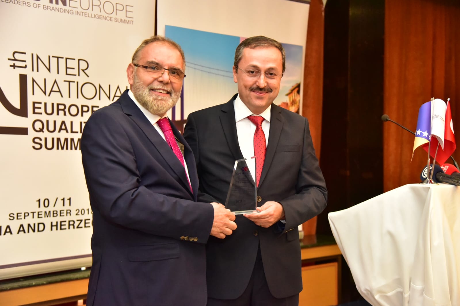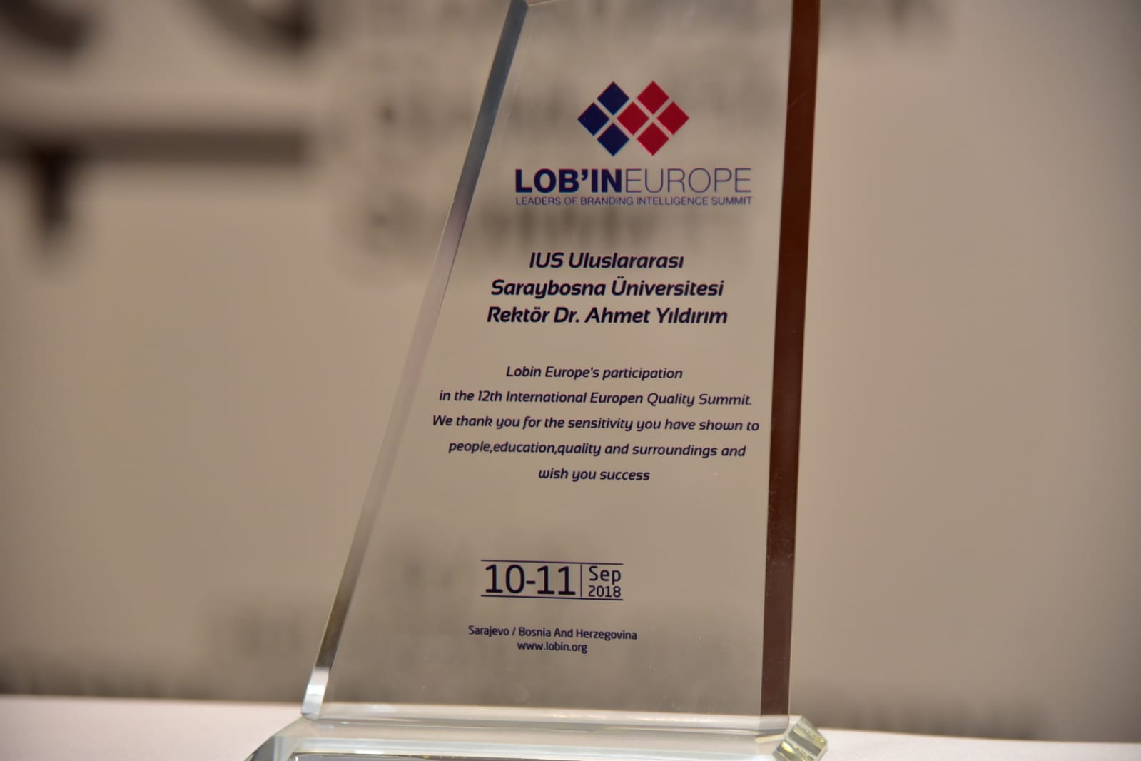 The award was presented to the Rector of the International University of Sarajevo, Prof. Dr. Ahmet Yildirim for participation in the 12th International European Quality Summit. With this award, Lob'in organization especially praised the sensitivity which IUS has shown to people, education, quality, and surroundings.