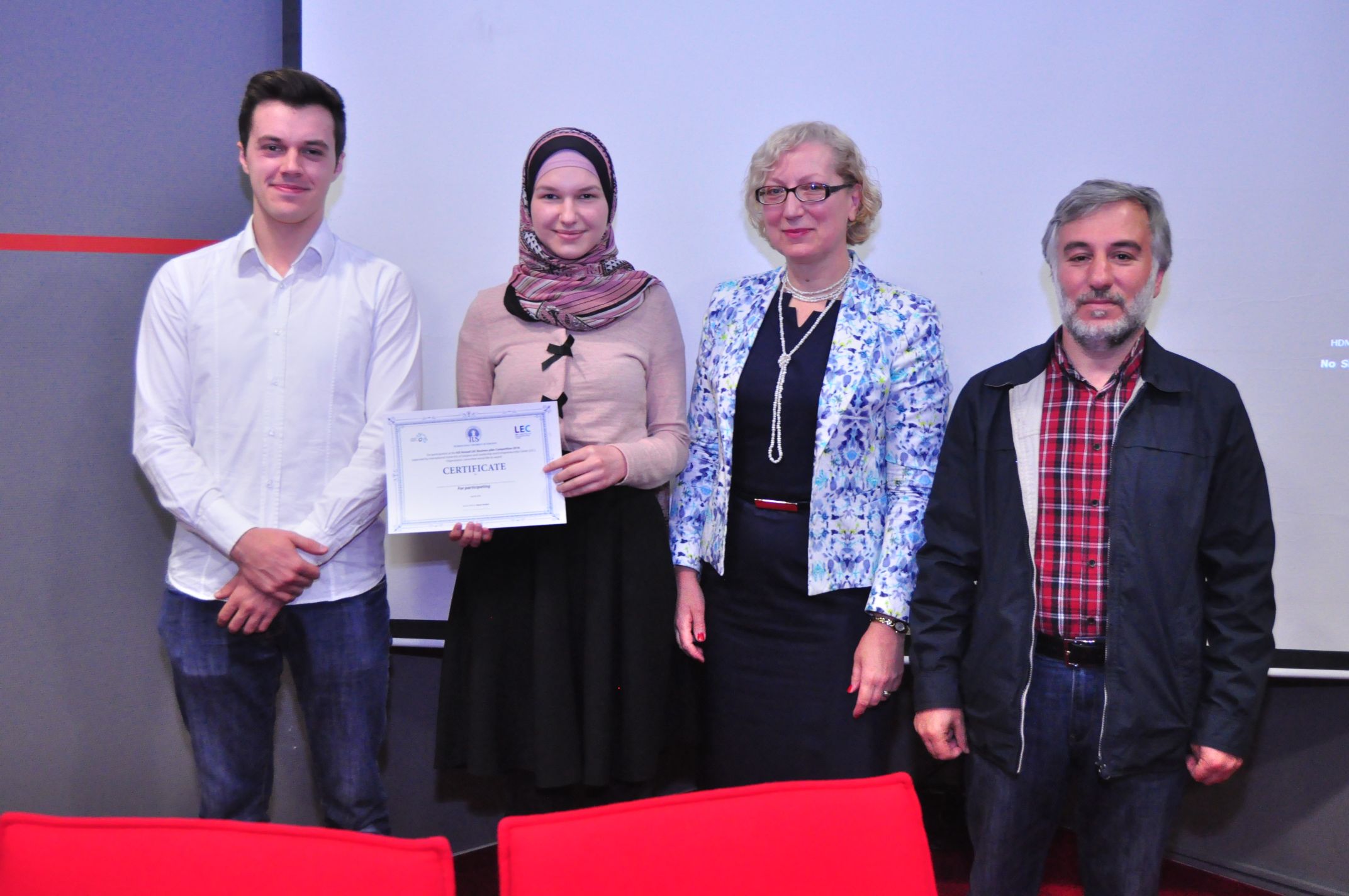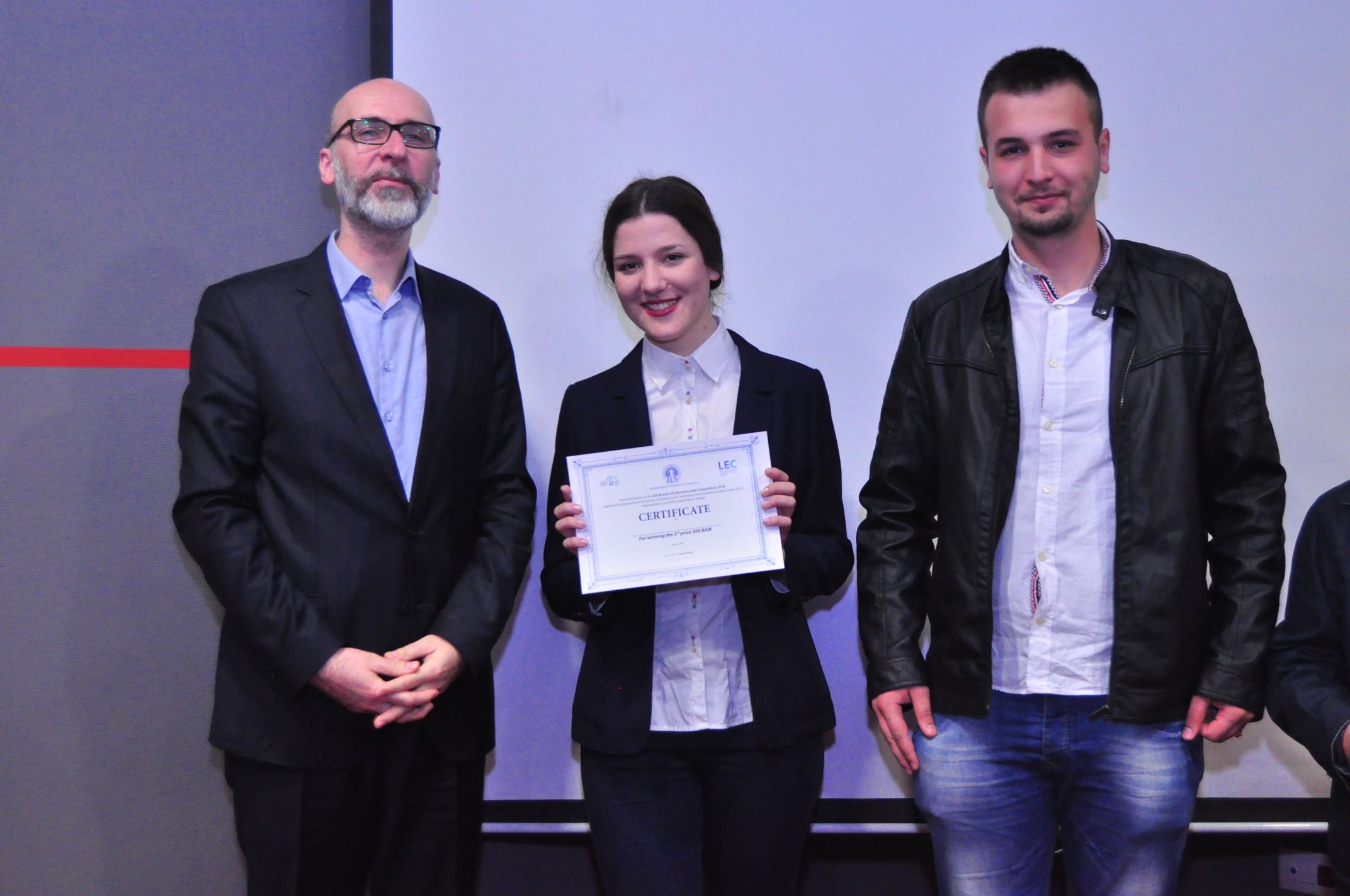 IUS Leadership and Entrepreneurship Center (LEC) in cooperation with BBI Bank and Sarajevo Business Forum (SBF) has organized a business plan competition, for the second consecutive year, for all IUS students who were interested in participating in SBF. Final day of competition was on 28th of April 2016. The aim of this project was not pure competiton, but rather a learning process that will tomorrow result in at least one enterprise that will be able to survive and employ people. IUS Business Plan Competition represents the comprehensive platform that assists to student entrepreneurs and their teams in developing and launching their businesses. Further, this competition provides the network for brainstorming, feedback and future business opportunities. All participants had to pass through one round before final presentation. Committee Members were: Assoc. Prof. Dr. Hasan Korkut (Chairman), Ms. Azra Colic, (Representative of BBI Bank), Prof. Dr. Fuat Gurcan, Assoc. Prof. Dr. Muhidin Mulalic, Assoc. Prof. Dr. Ibrahim Dursun and Assist. Prof. Dr. Ramo Palalic