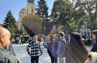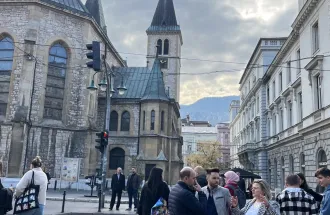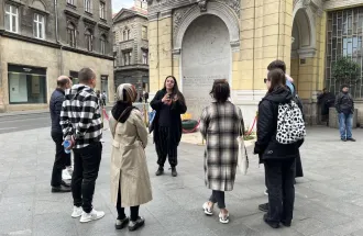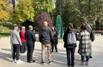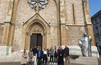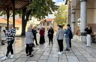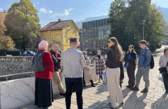 On Wednesday, October 19, 2022, the delegations from the University of Zielona Góra, the University of Craiova, and the ELIT/ELT staff went on a sightseeing tour of Sarajevo. They visited all the important sites, such as the Cathedral, the Orthodox Church, Gazi Husrev-bey’s Mosque, the Synagogue, the Eternal Flame (Vječna vatra), the Monument to the Children of Besieged Sarajevo, and the Market Place (Markale) as well as all the important museums and bridges in Sarajevo. They had a delicious lunch at Baščaršija (Old Town) and finished the tour in the City Hall (Vijećnica) where they were warmly welcomed by the Mayor of Sarajevo, Dr. Benjamina Karić.