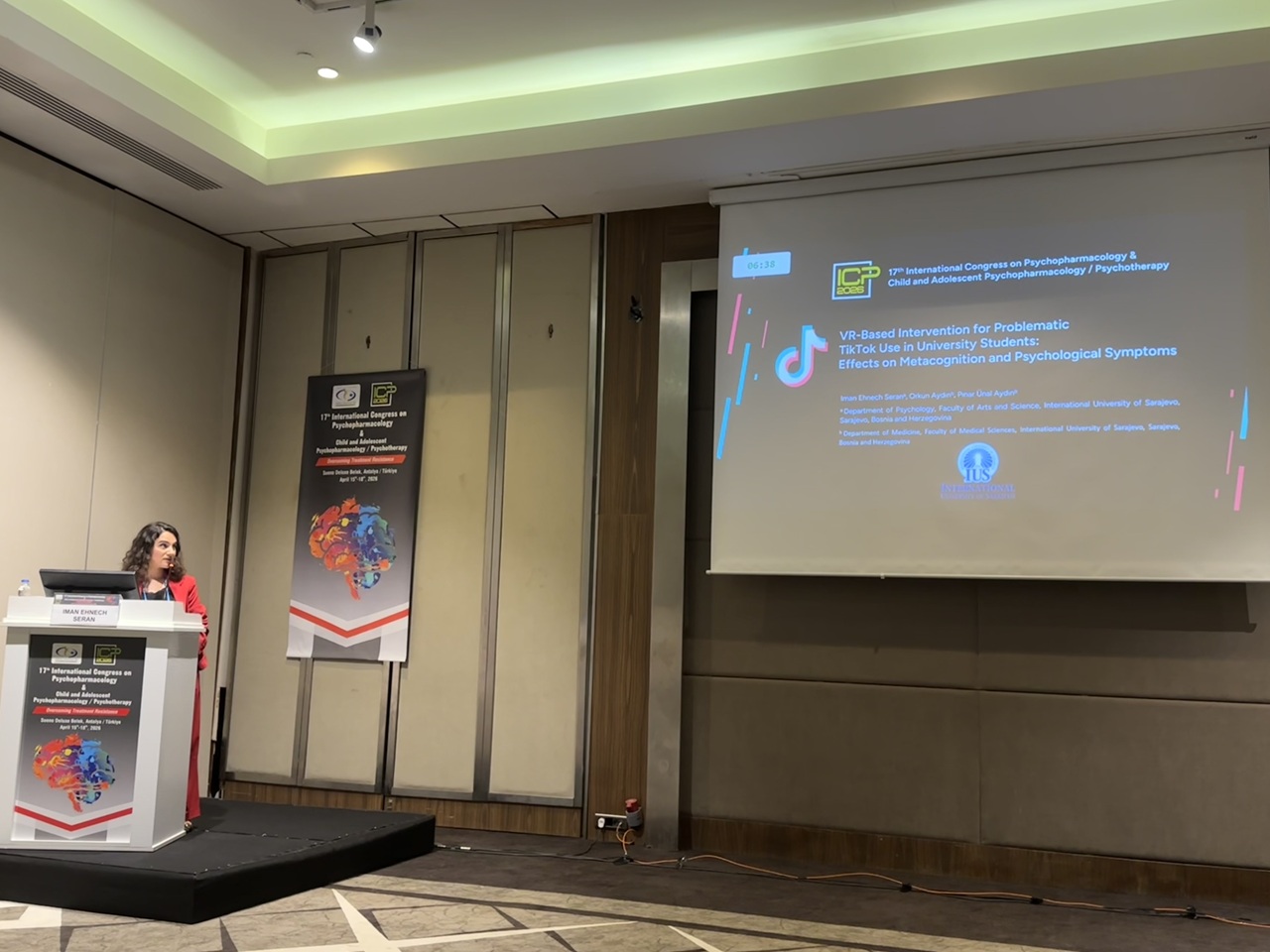 At this prestigious international scientific congress, she presented her research as an oral presenter. Her study, titled “VR-Based Intervention for Problematic TikTok Use in University Students: Effects on Metacognition and Psychological Symptoms,” was conducted in collaboration with Assoc. Prof. Dr. Pınar Ünal-Aydın and Assoc. Prof. Dr. Orkun Aydın from the IUS Faculty of Medical Sciences (FMS).