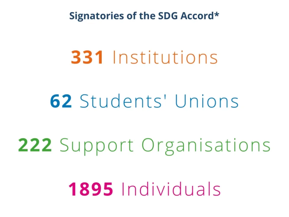 The signatories of the SDG Accord are: 331 institutions, 62 student unions, 222 organizations, and 1,895 individuals from around the world. The signatories of the Accord undertake to incorporate the goals of sustainable development into their activities: education, research, leadership, operational activities, administration and social engagement. Also, the SDG Accord is a public declaration of the commitment of those institutions to share and report on their progress in the field of the SDGs.
