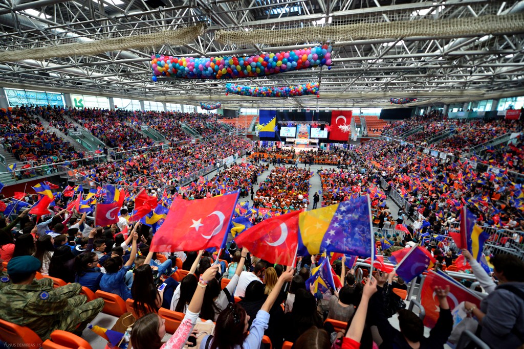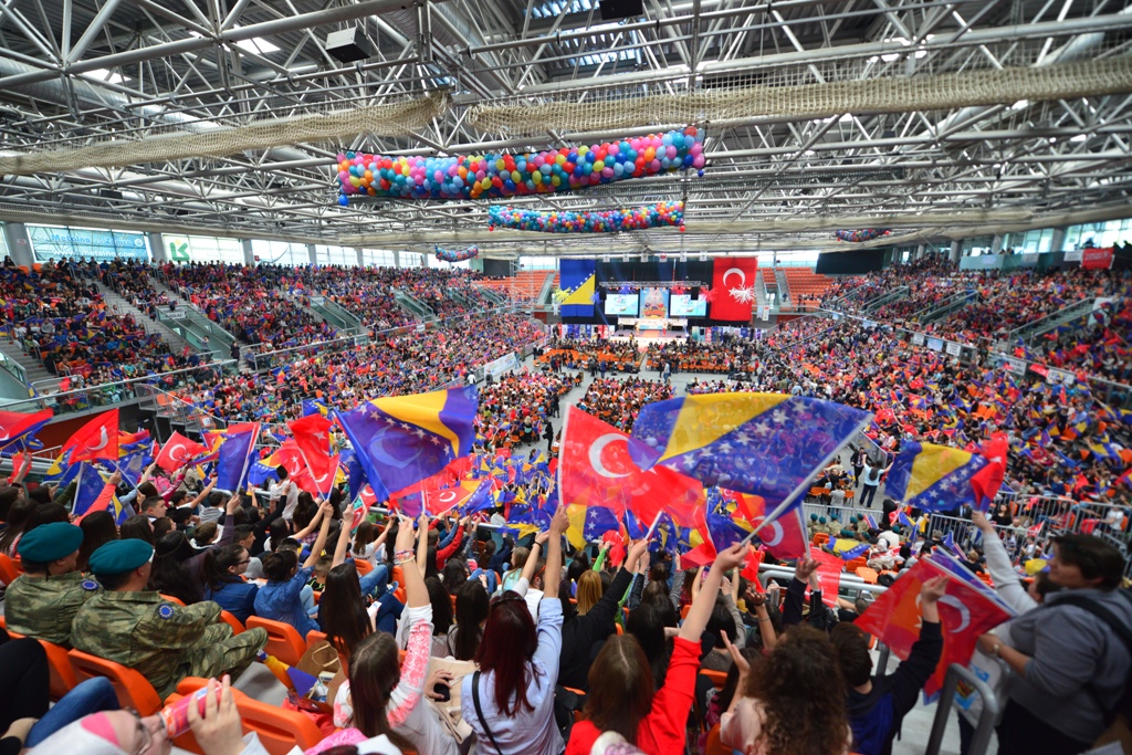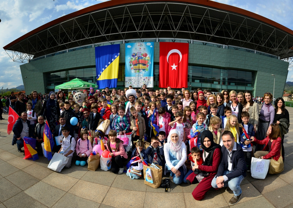Embassy of the Republic of Turkey in Bosnia and Herzegovina, Turkish Cultural Centre Yunus Emre, Turkish Military Mission in BiH and Office of Tourism and Culture of the Turkish Embassy in BiH as well as Association of Friendship Bridges BiH-Zenica organized in the City Arena in Zenica the biggest celebration outside the country, of this great holiday of the Republic of Turkey - 23 April, International Children's Day. For organization of this event approximately half a million BAM were spent. Five kilometers of the city streets were covered with Bosnian and Turkish flags, where along with police officers in police uniforms on duty were also children from Zenica schools. On this occasion, about 6,000 children, who learn Turkish in their schools, arrived to Zenica from all parts of our country. Hosts of the event prepared for them the same number of packages with variety of gifts and surprises, including Bosnian and Turkish flags.