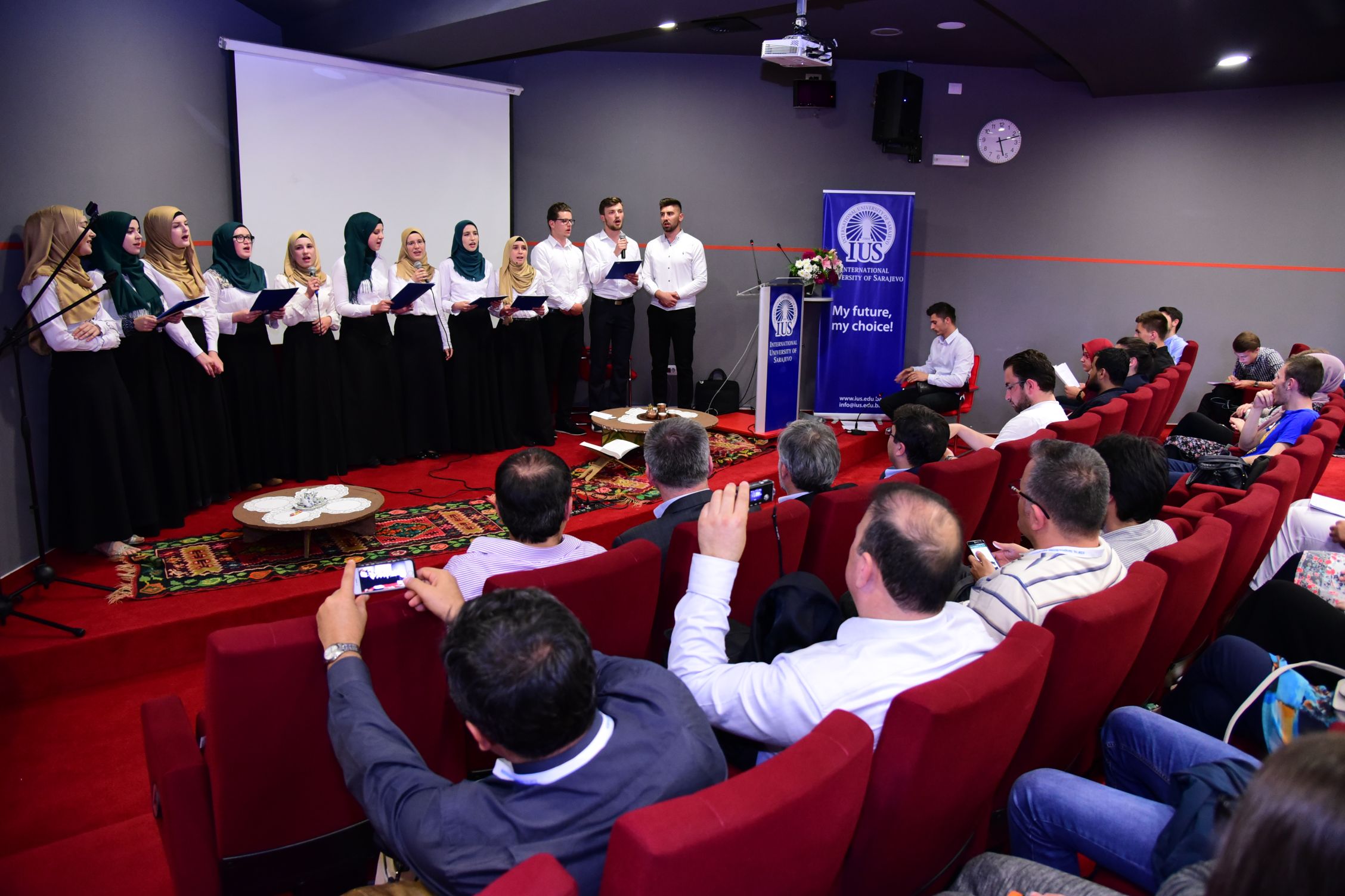 The manifestation was attended by IUS Rector Prof. Dr. Yücel Oğurlu, Vice-rectors, as well as academic staff of University. At the beginning of the program, hfz. Yaser Al-Ziyad, honored the audience with the melodic learning last Book of Allah, whose revelation began just in Ramadan. This was followed by a series of Ilahi and recitations performed by EMSA choir. In order to manifest a special honor and pleasure and represent the fact that they are at this performance for the first time, the Assoc. Prof. Dr. Lejla Miller joined as a member of the choir.