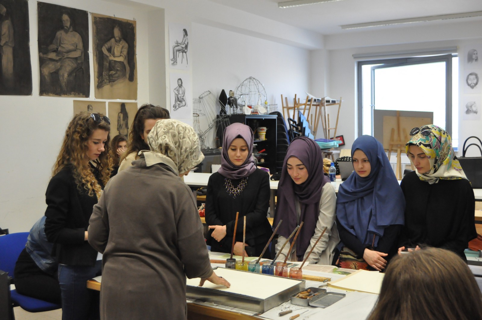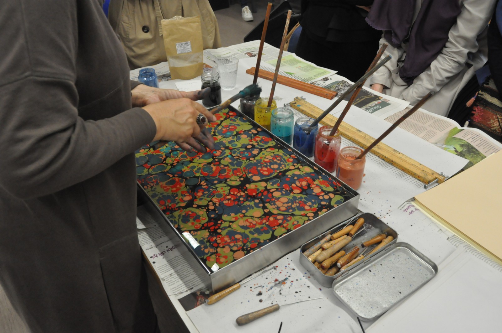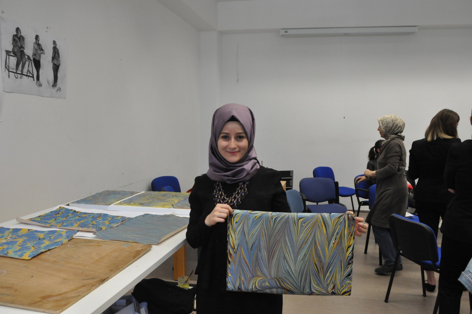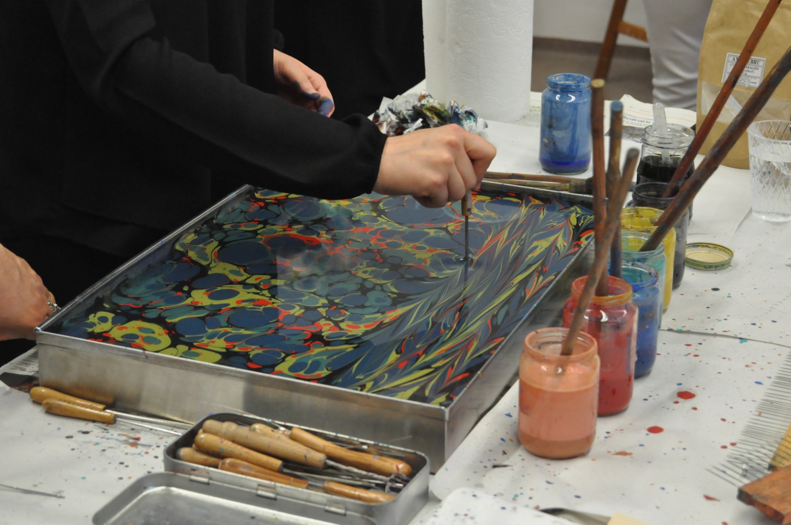 On May 17, 2017, master of Ebru Nihal Türe held a workshop for the students of Visual Arts and Communication Design (VACD) at the International University of Sarajevo (IUS). Mrs. Türe introduced the workshop participants to some of the fundamental styles of the Ebru (traditional Turkish paper marbling), whilst students had an opportunity to try using this very complex technique.
