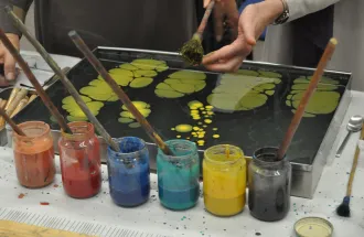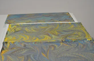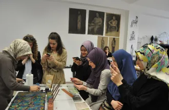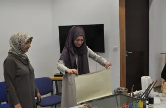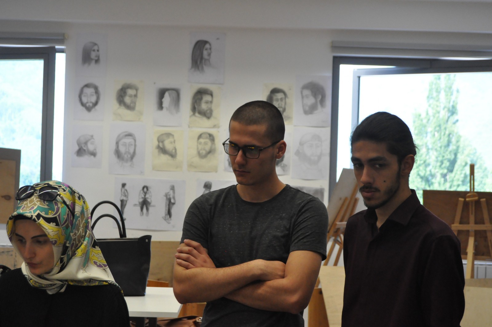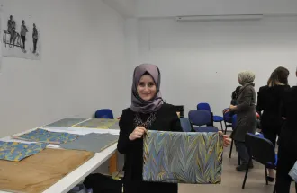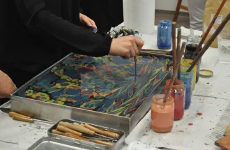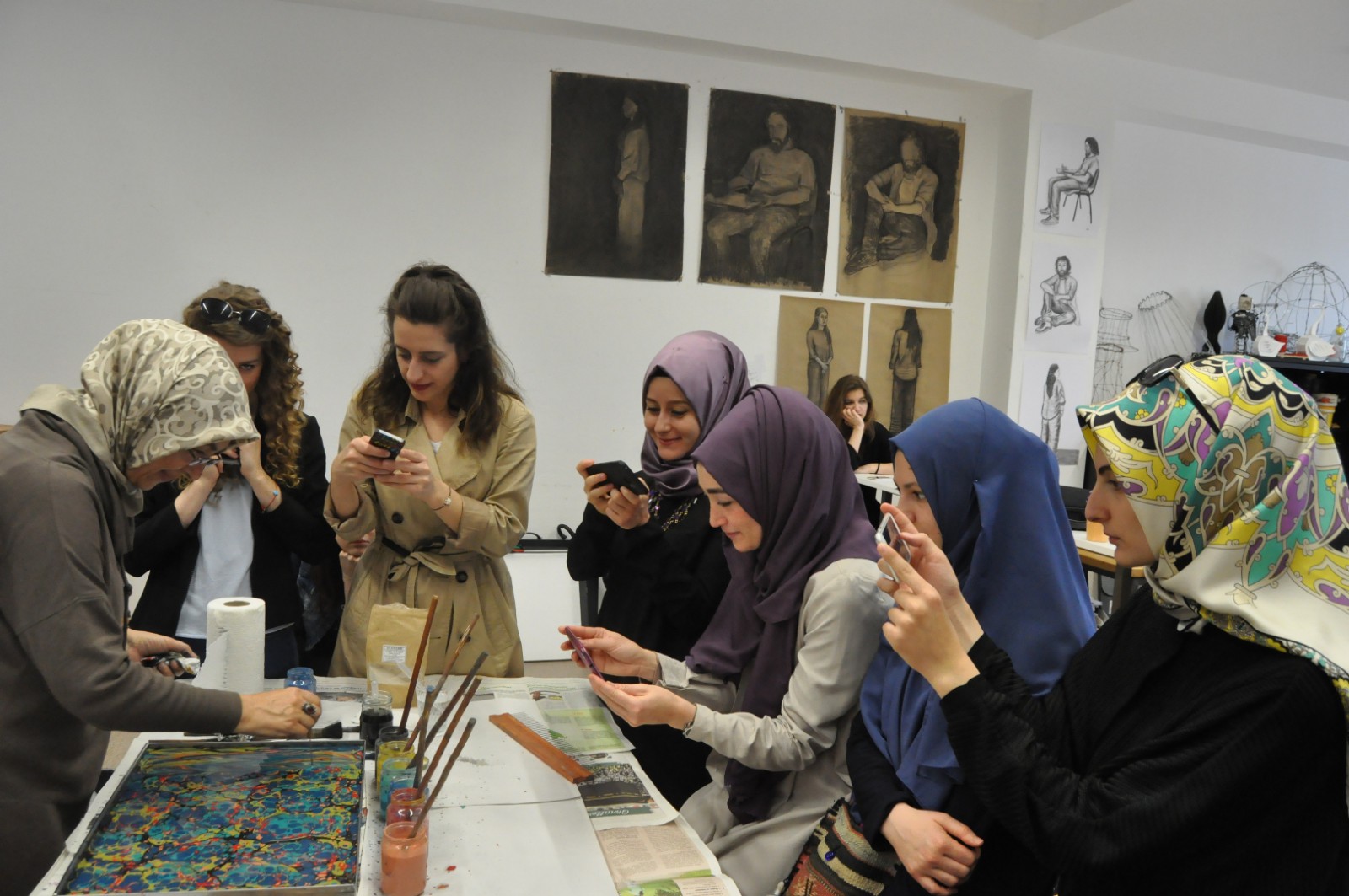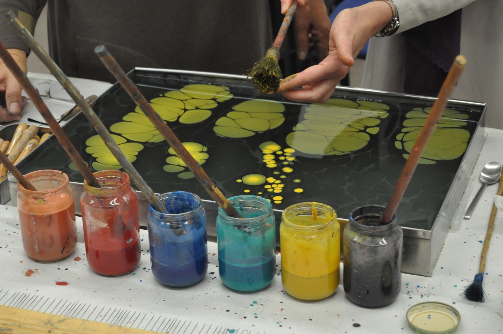 On May 17, 2017, master of Ebru Nihal Türe held a workshop for the students of Visual Arts and Communication Design (VACD) at the International University of Sarajevo (IUS). Mrs. Türe introduced the workshop participants to some of the fundamental styles of the Ebru (traditional Turkish paper marbling), whilst students had an opportunity to try using this very complex technique.