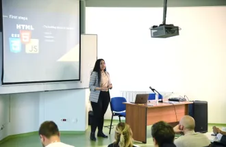 Ms. Radušić explained the benefits of being a Frontend Developer. She said that if you like seeing your results immediately, then it is the right position for you. She also presented the tools students, future professionals, will need in their work as Frontend Developers, such as the building blocks of the Web: HTML, CSS and JS. In addition, she explained the advantages and disadvantages of React JS, a JavaScript Library and Angular, a web application framework, which are generally used by Frontend Developers.
