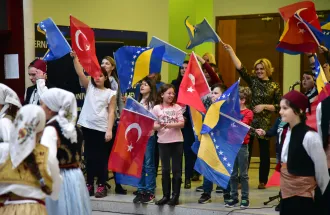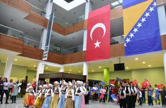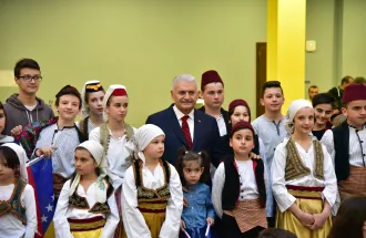 Prime Minister of Republic of Turkey Binali Yıldırım who was in Bosnia and Herzegovina for an official visit had a meeting with IUS students and academic staff at the university. Delegation was welcomed by the by president of Foundation for Education Development Sarajevo (SEDEF), Mr. Hasan Topaloğlu, IUS Acting Rector Prof. Dr. Ahmet Yıldırım, Vice Rector Prof. Dr. Metin Toprak and faculty deans. After the welcoming ceremony that Chairman of the Council of Ministers of Bosnia and Herzegovina Dr. Denis Zvizdić joined, the delegation attended dance show prepared by pupils from Foundation’s Primary School “Isa-beg Ishaković” in foyer area of the university. PM Binali Yıldırım had a photo taken with these students.