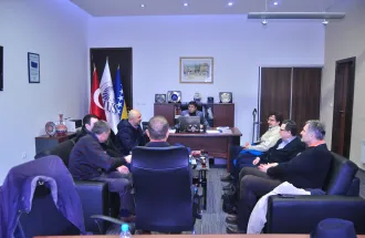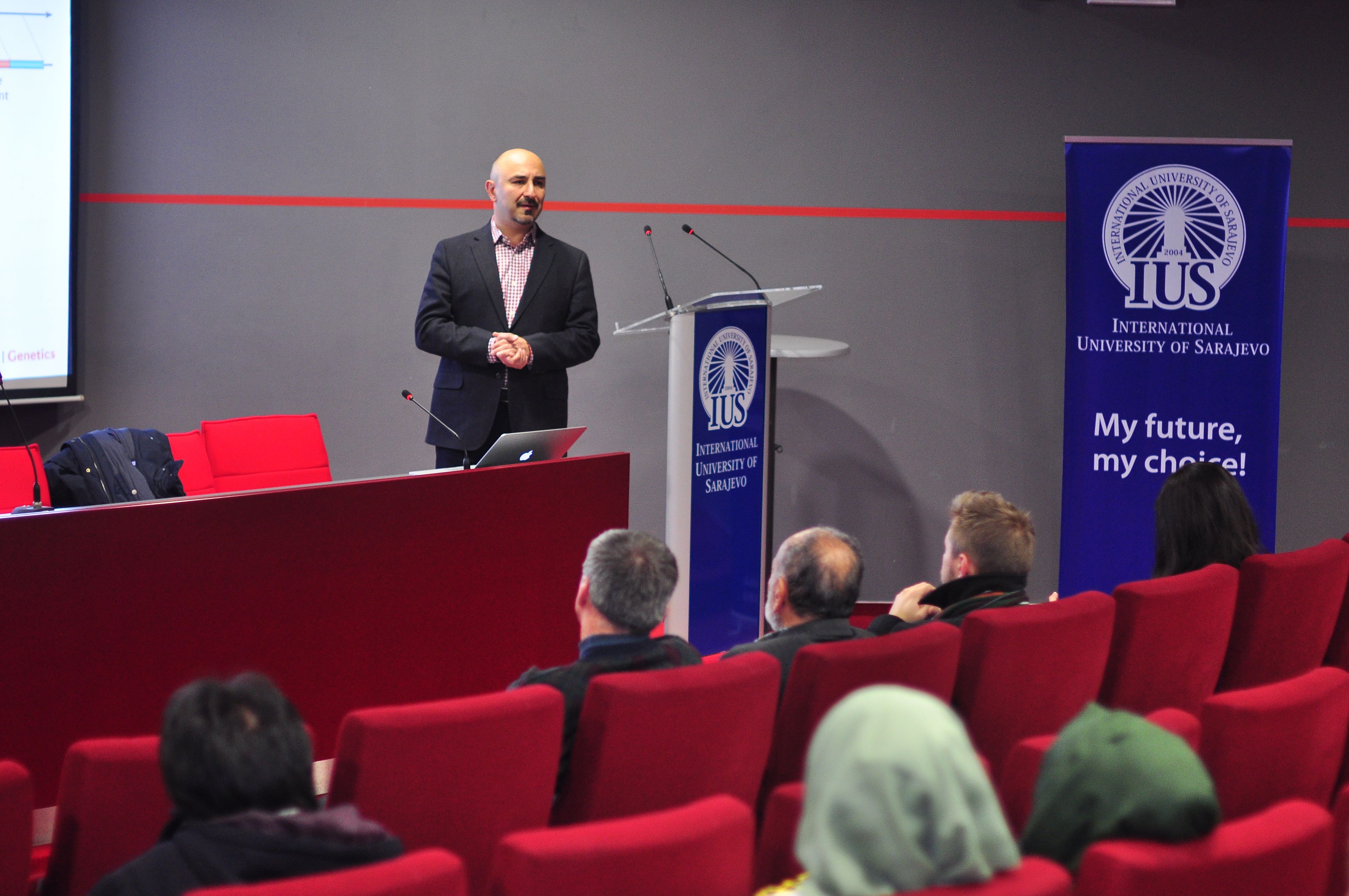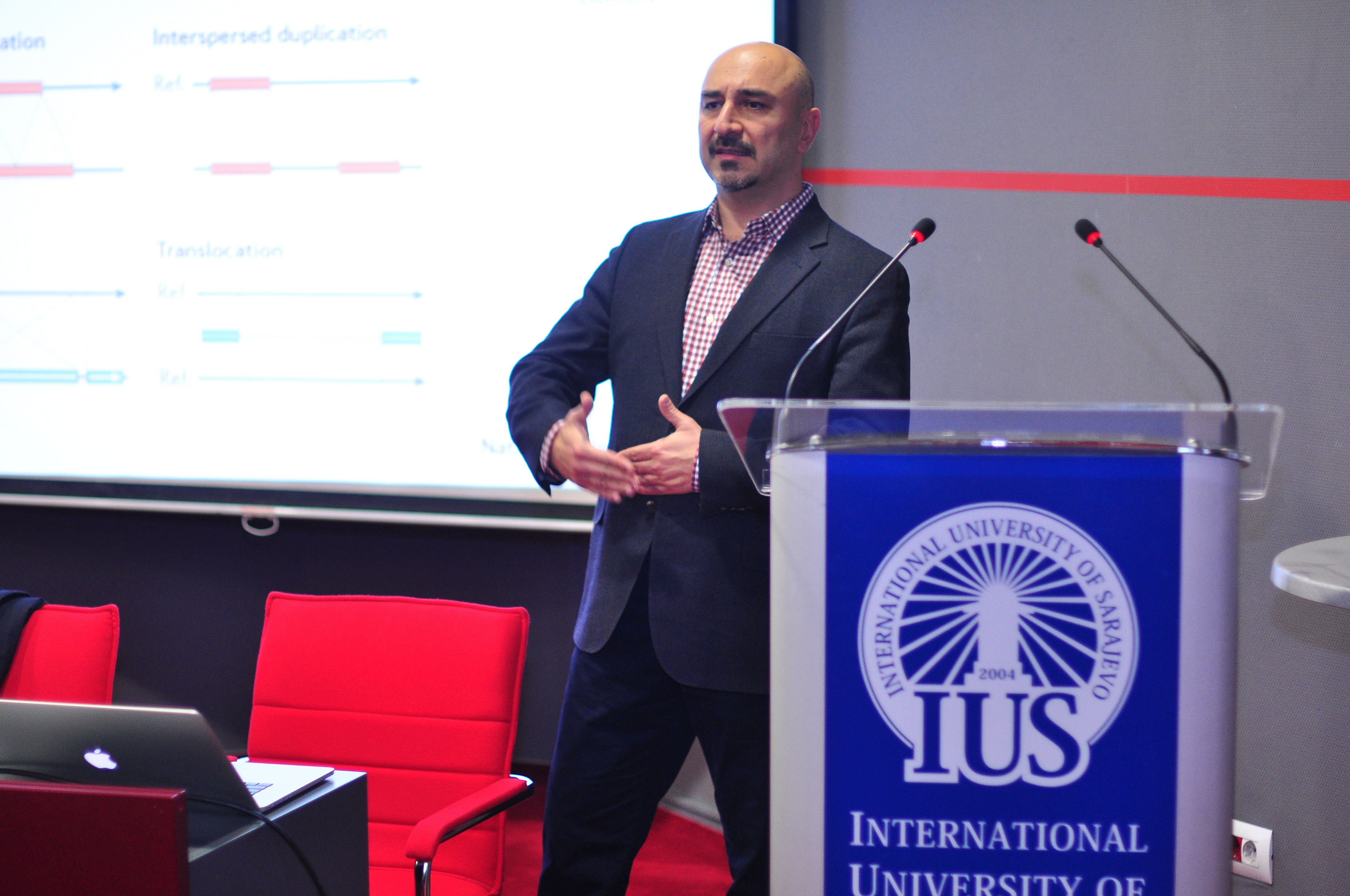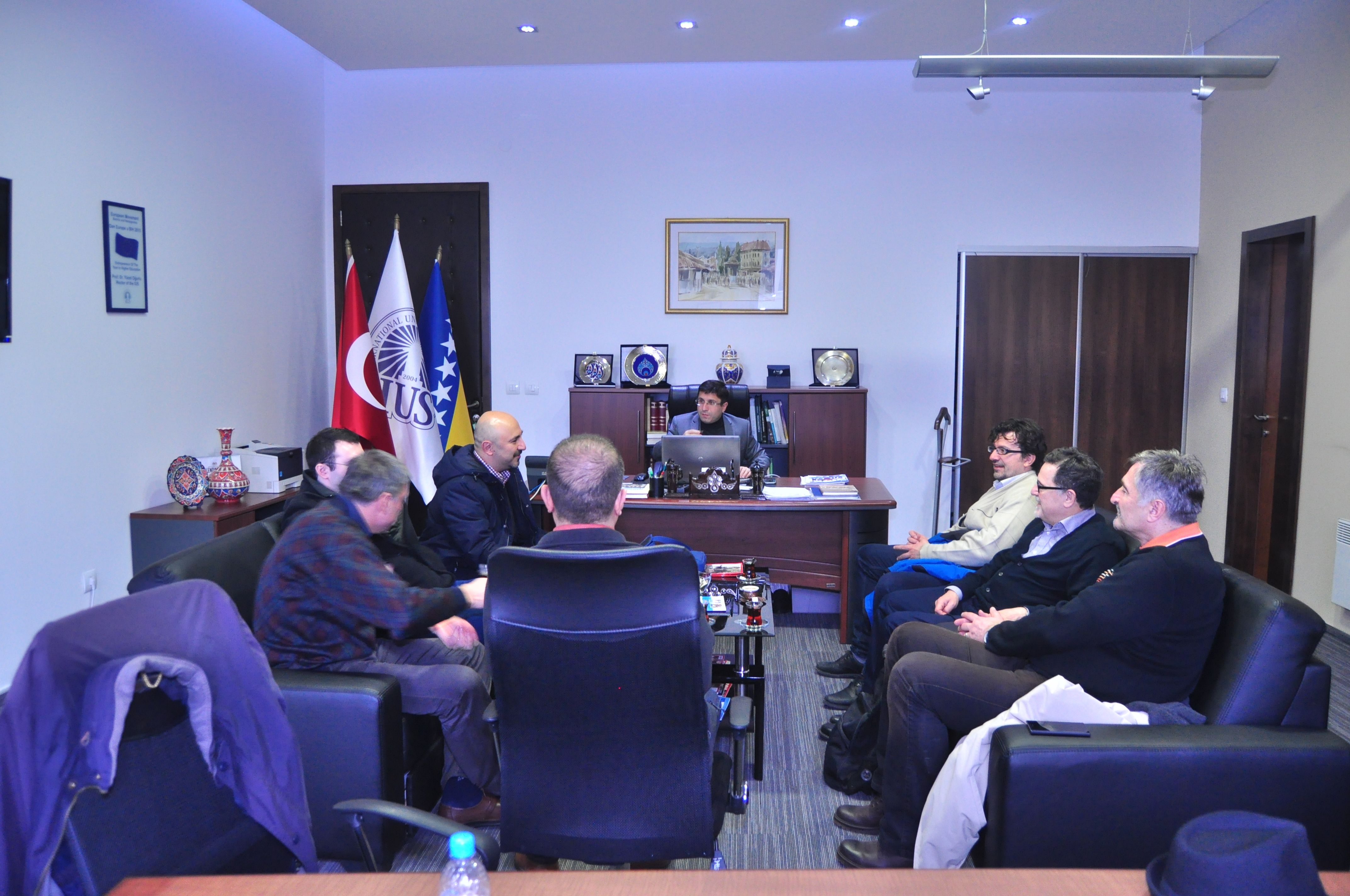 Award winning professor of the Faculty of Engineering and Natural Sciences (FENS) Assoc. Prof. Dr. Haris Gavranović organized a lecture at the International University of Sarajevo (IUS) of a renowned Prof. Dr. Cenk Sahinalp from the Centre for Bioinformatics Research School of Informatics and Computing at Bloomington, Indiana, (USA) on Thursday, December 10, 2015. IUS Rector, Prof. Dr. Yücel Oğurlu welcomed distinguished speaker in the Rectorate with his associates, Vice Rector for International Cooperation and Research Assoc. Prof. Dr. Ali Gürsel, Dean of the Faculty of Engineering and Natural Sciences (FENS), Prof. Dr. Fuat Gürcan and Assoc. Prof. Dr. Haris Gavranović. During the meeting Rector Oğurlu briefly presented information about the current work and achievements of the University and also thanked Prof. Sahinalp for taking the time to come to IUS and deliver the lecture. After the meeting, the lecture was held in the main amphitheater of the IUS.