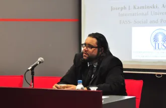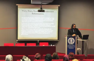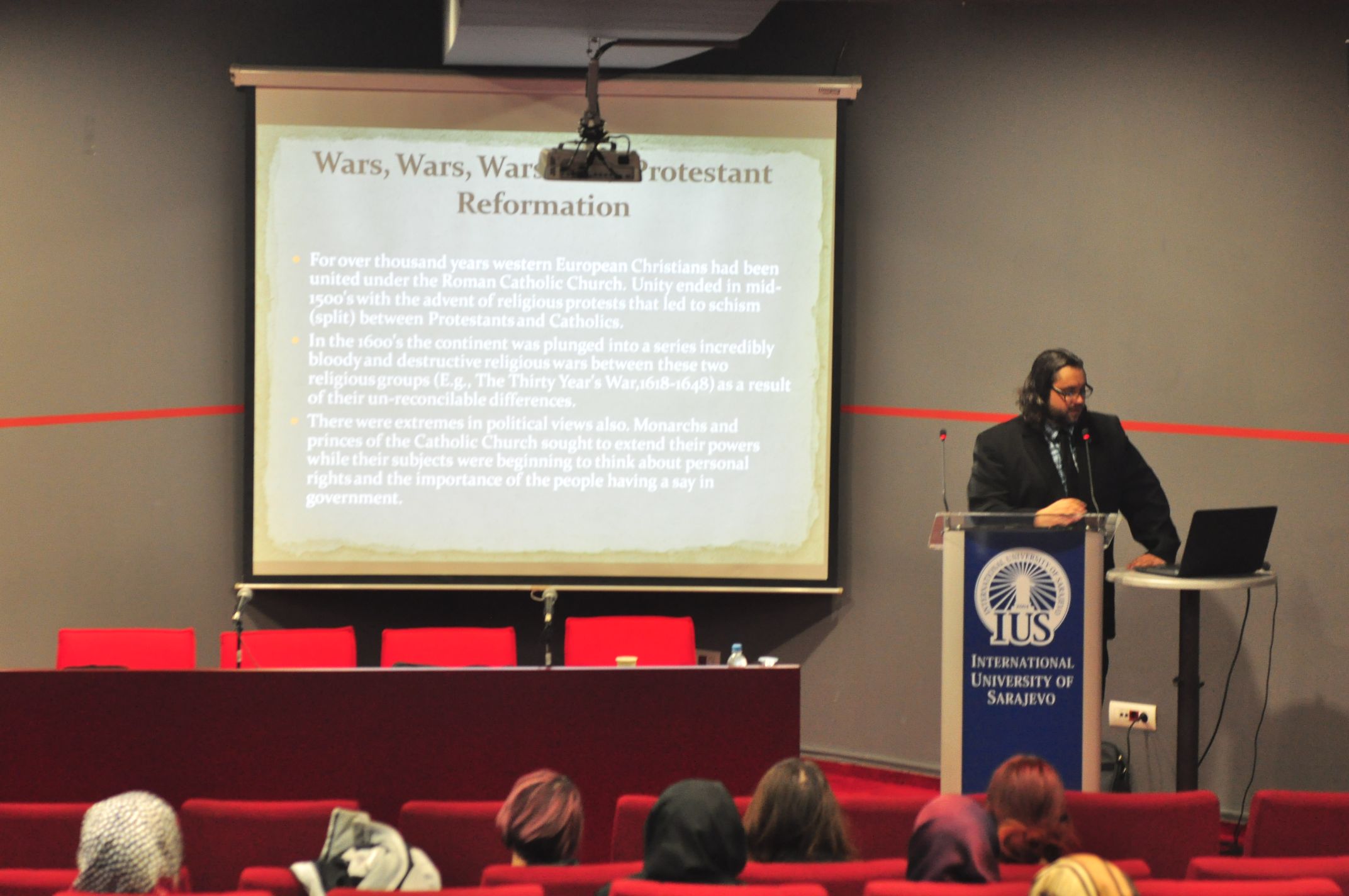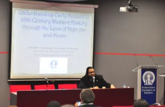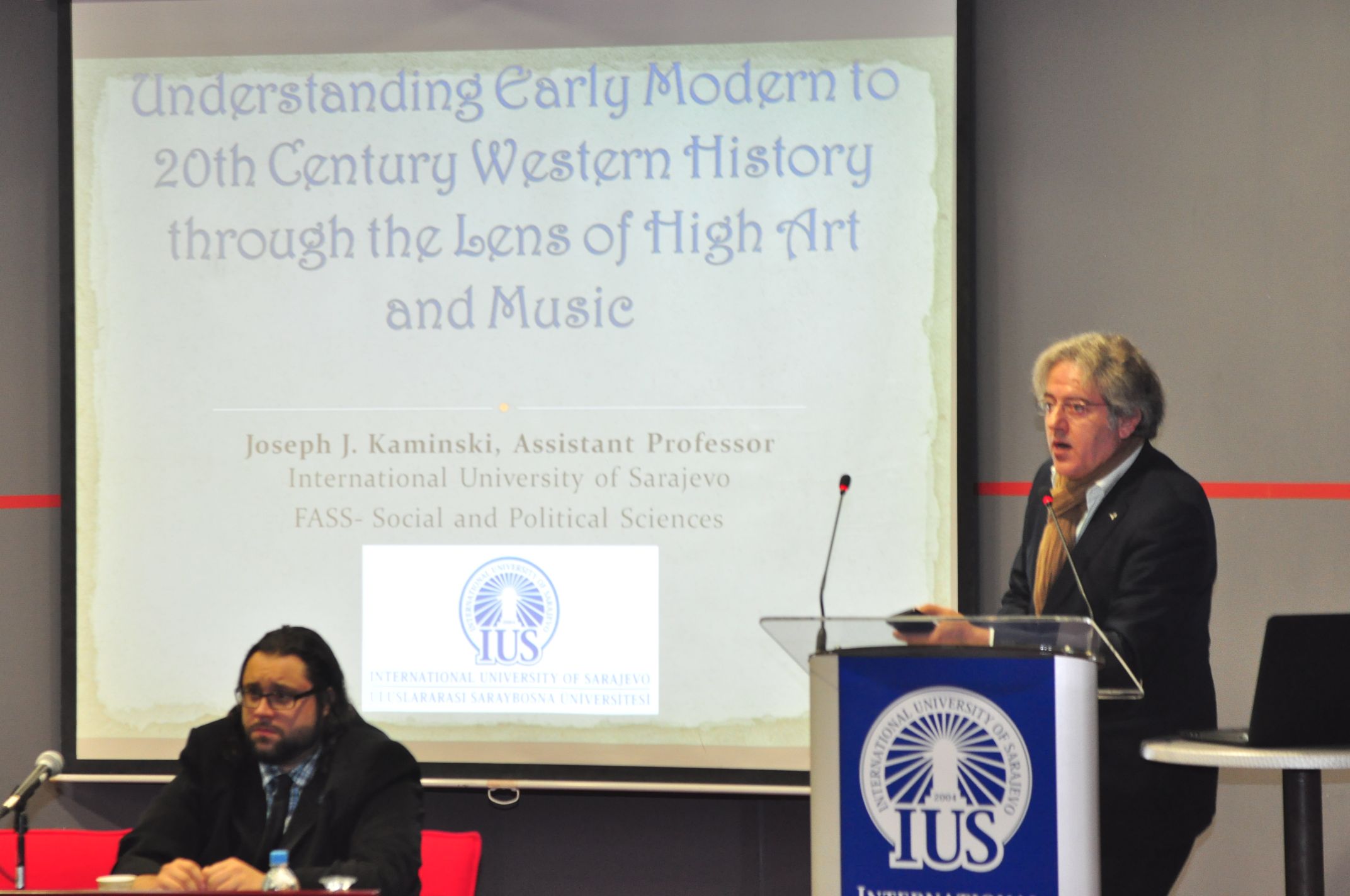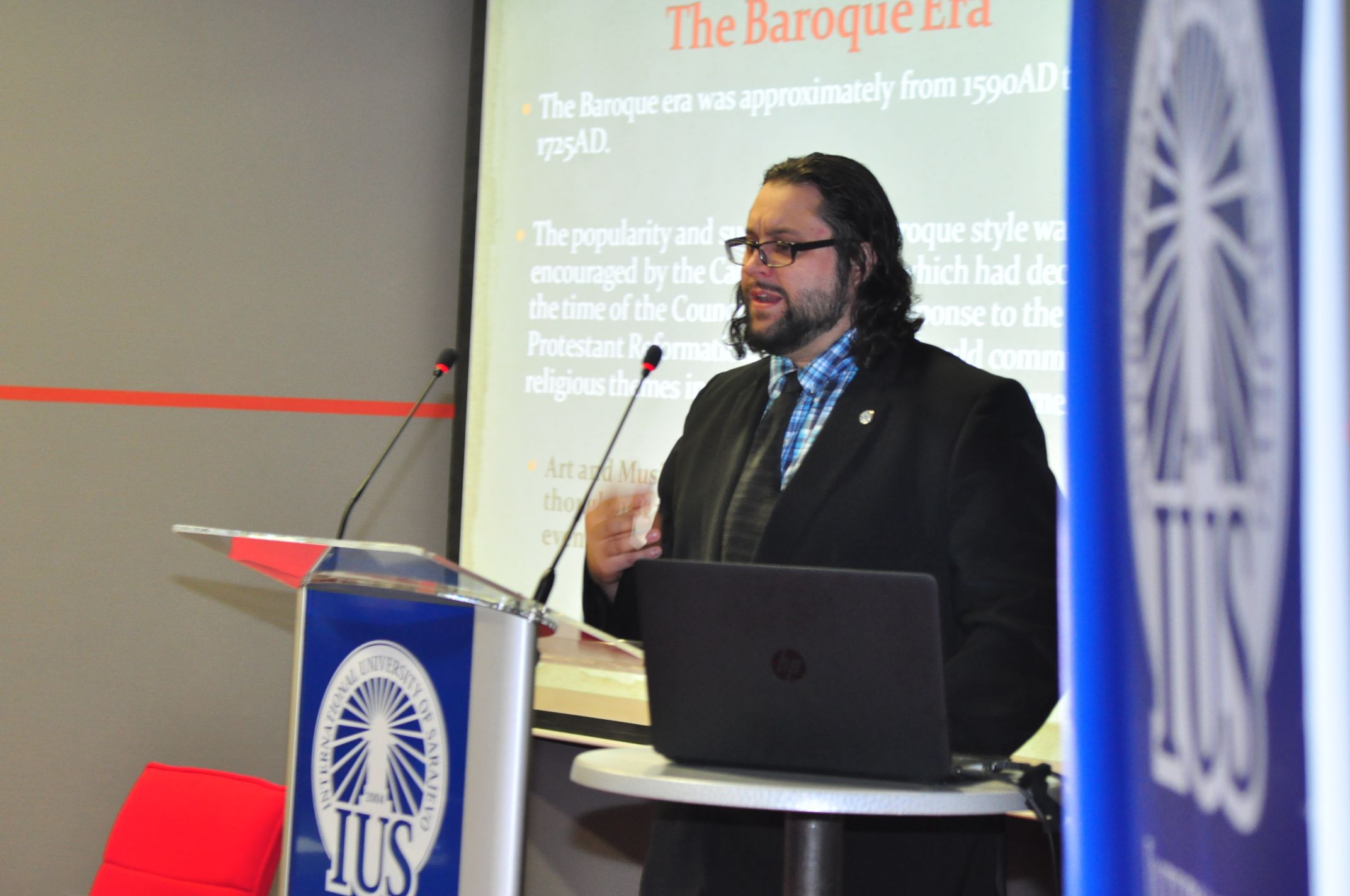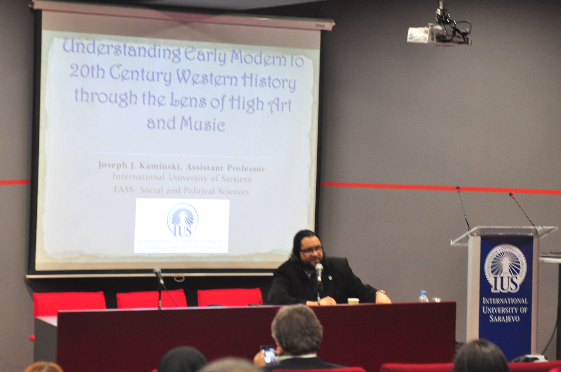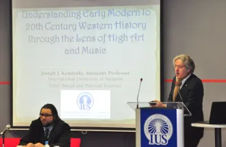 On Thursday, Jan 8, 2015, in the main amphitheater, Assistant Prof. Dr. Joseph Kaminski gave a presentation about the connections between art and music, and political events throughout the past 400 years of Western European history. His main point was that one can notice stylistic changes in both the form and content of works of art/music and how often these changes reflect their contemporary historical conditions. For example, in the presentation, it was discussed how hierarchical, socially rigid, and religious the Baroque area was in general, and how the music and art both demonstrated high levels of structure, counterpoint, and generally stable levels of loudness.
