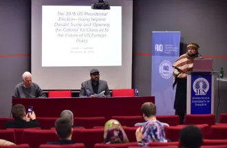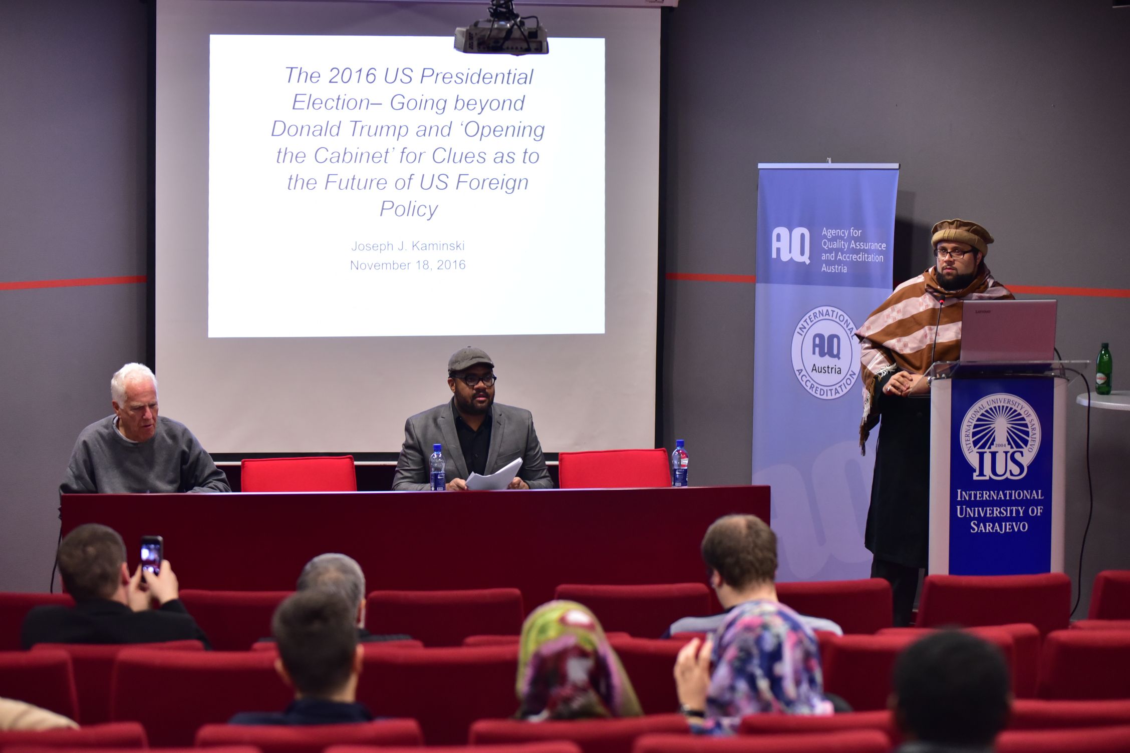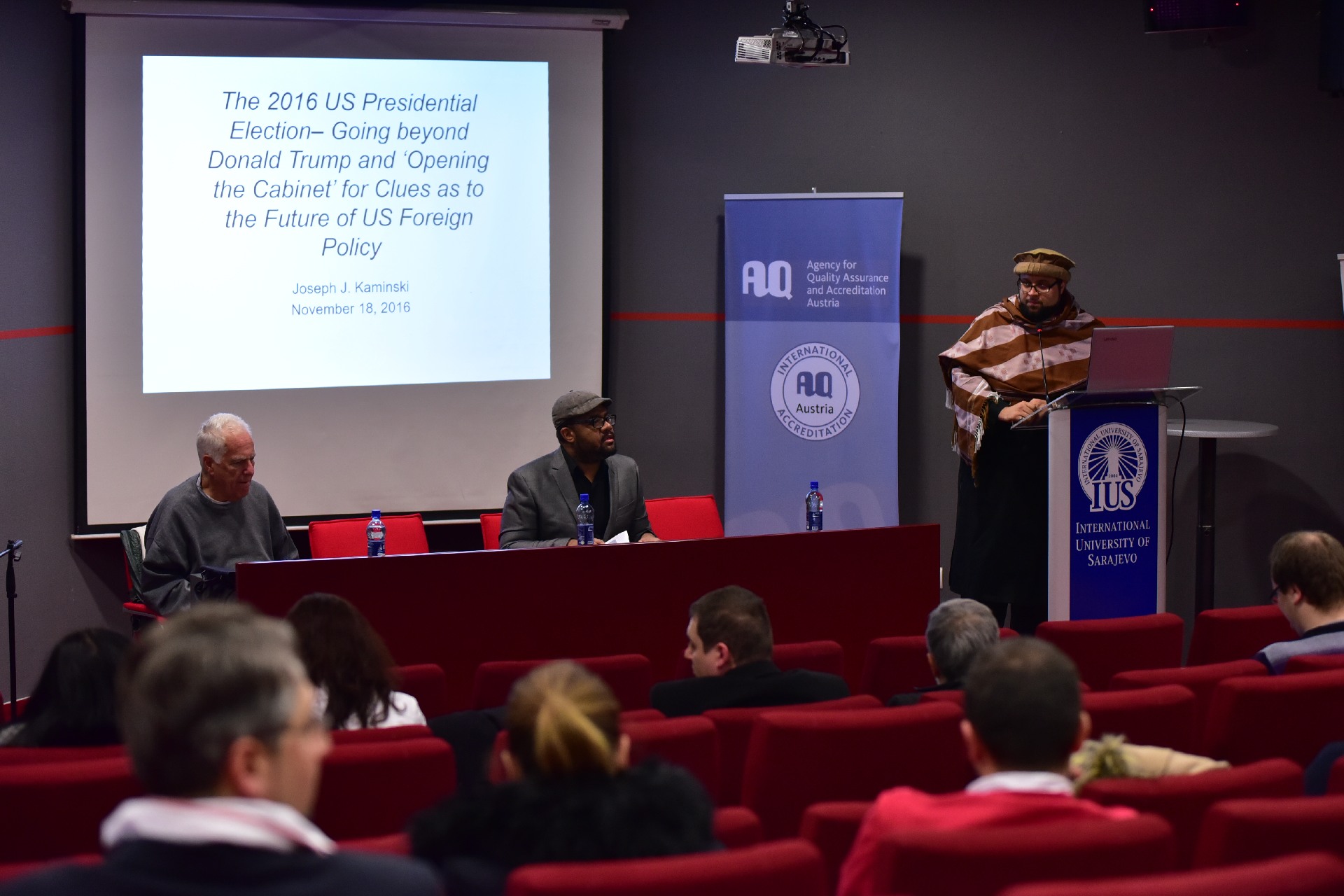 Today, on November 18th 2016, Round table was held at International University of Sarajevo. Round table is named: Presidential Election 2016, organized by Assist. Prof. Dr. Joseph J. Kaminski and speakers such as: Emeritus Prof. Dr. Harry Miller, Assoc. Prof. Dr. Metin Bosnak and Assist. Prof. Dr. Jared O’Neil Bell. The audience had a chance to be introduced into very different perspectives on very important US Presidential Election. Discussion faced with the pre-election period in the United States of America, such as presidential campaigns, the most important speeches by candidates, and opinions of the mass.