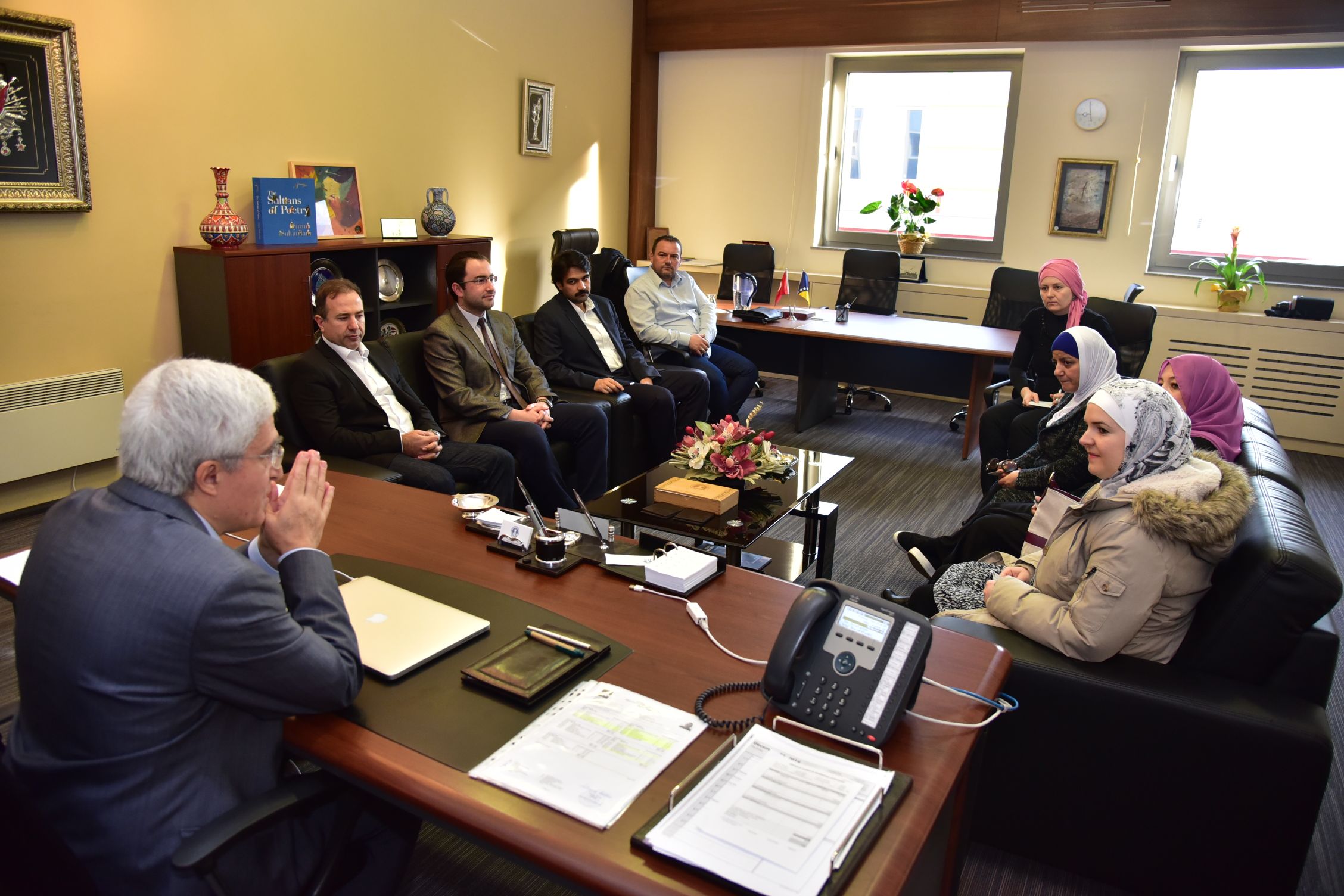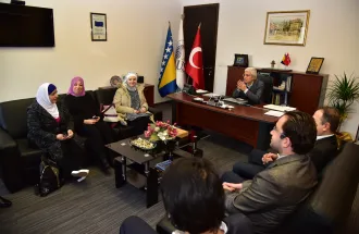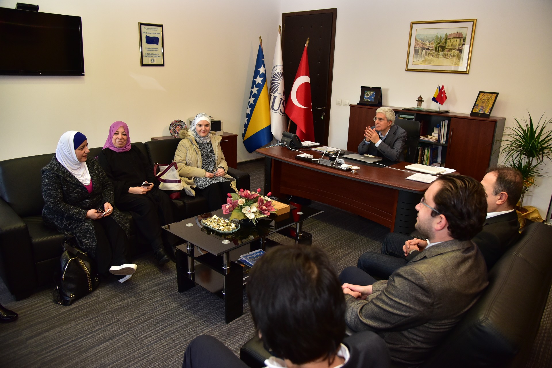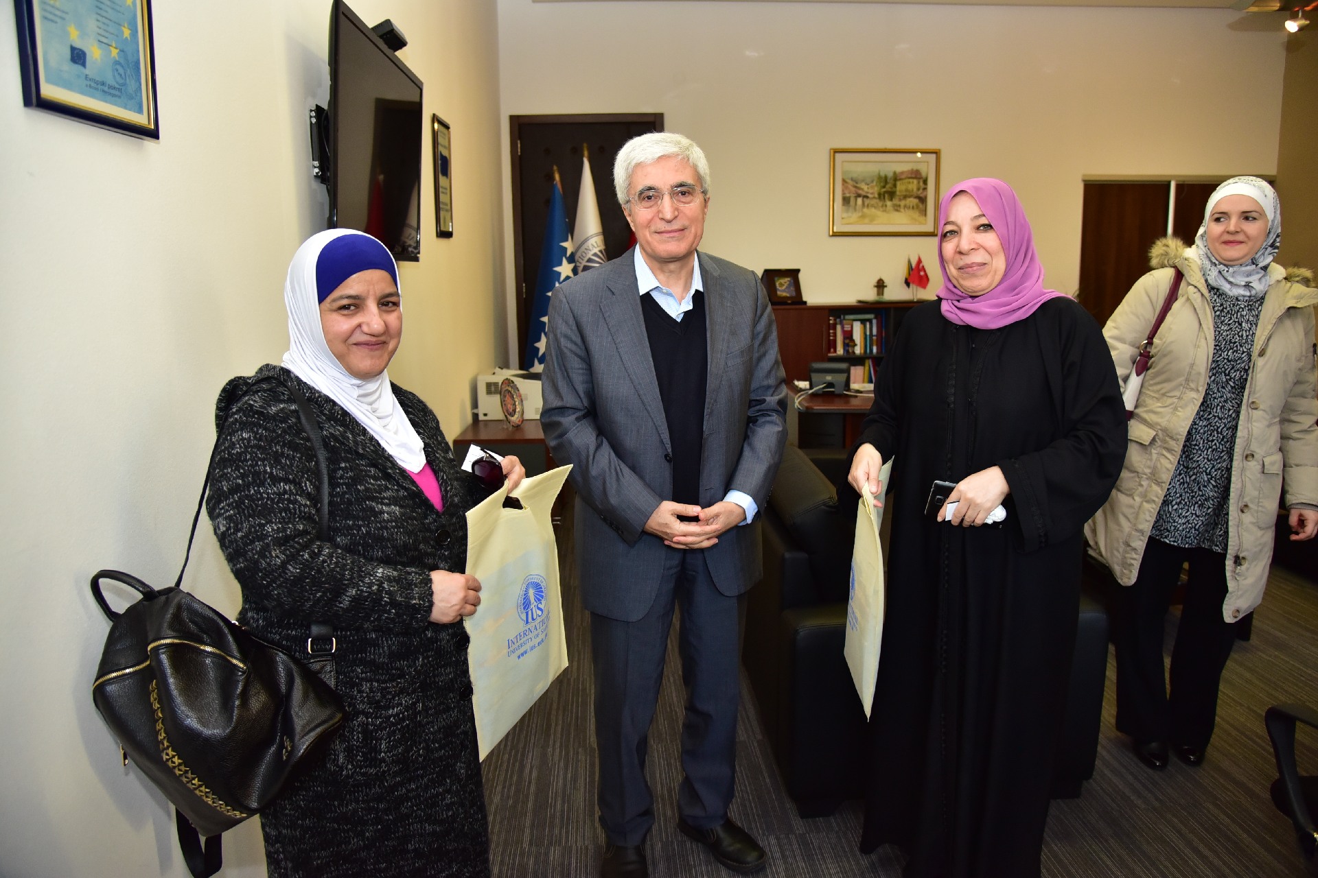 Friday at IUS marked with a lot of activities and events. In the early morning, December 2, 2016, UAE Ministry Representatives visited Rector Prof. Dr. Tahsin Erkan Türe at International University of Sarajevo. Delegation was led by Ms. Manal Nazal and Ms. Maysoum Talhani. Nazal and Talhani visited IUS on behalf of the Administration for verification and evaluation of school testing and international tests. Beside the Rector of IUS, they were also welcomed by Advisor and Representative to the Rector Assist. Prof. Dr. Muhamed Ali, Vice-Rector for Int. Cooperation & Research Assoc. Prof. Dr. Ali Gürsel, Vice-Rector for Academic & Student Affairs Assist. Prof. Dr. Faruk Berat Akçeşme and General Secretary Mr. Armin Kerić. The meeting flew with the presentation of IUS, from foundational time until now, where IUS got accreditation for study programs, as the first institution in the high-education system in Bosnia and Herzegovina. The guests were very positively surprised by the developments at IUS and wished to the Rector better future and the huge number of projects. Rector expressed the satisfaction for this visit and wished strong connection with UAE’s educational institutions.