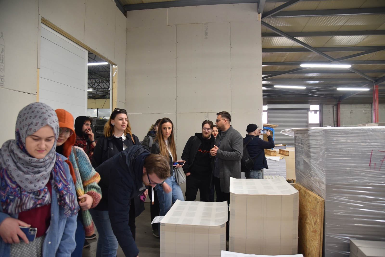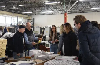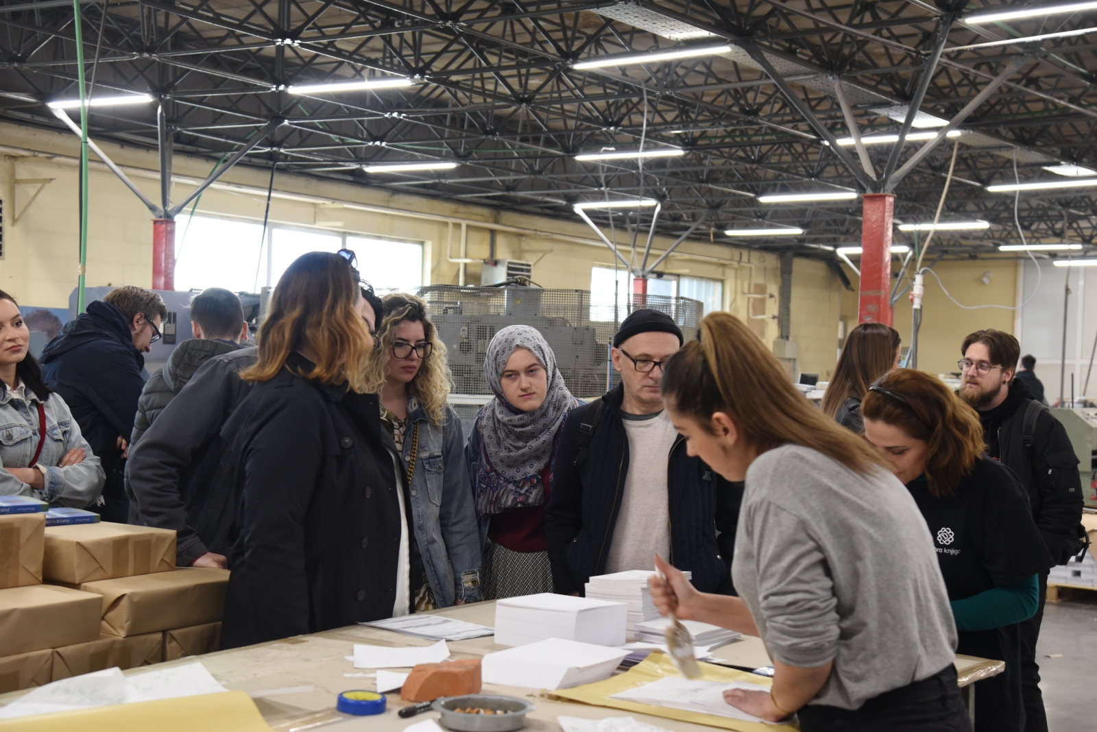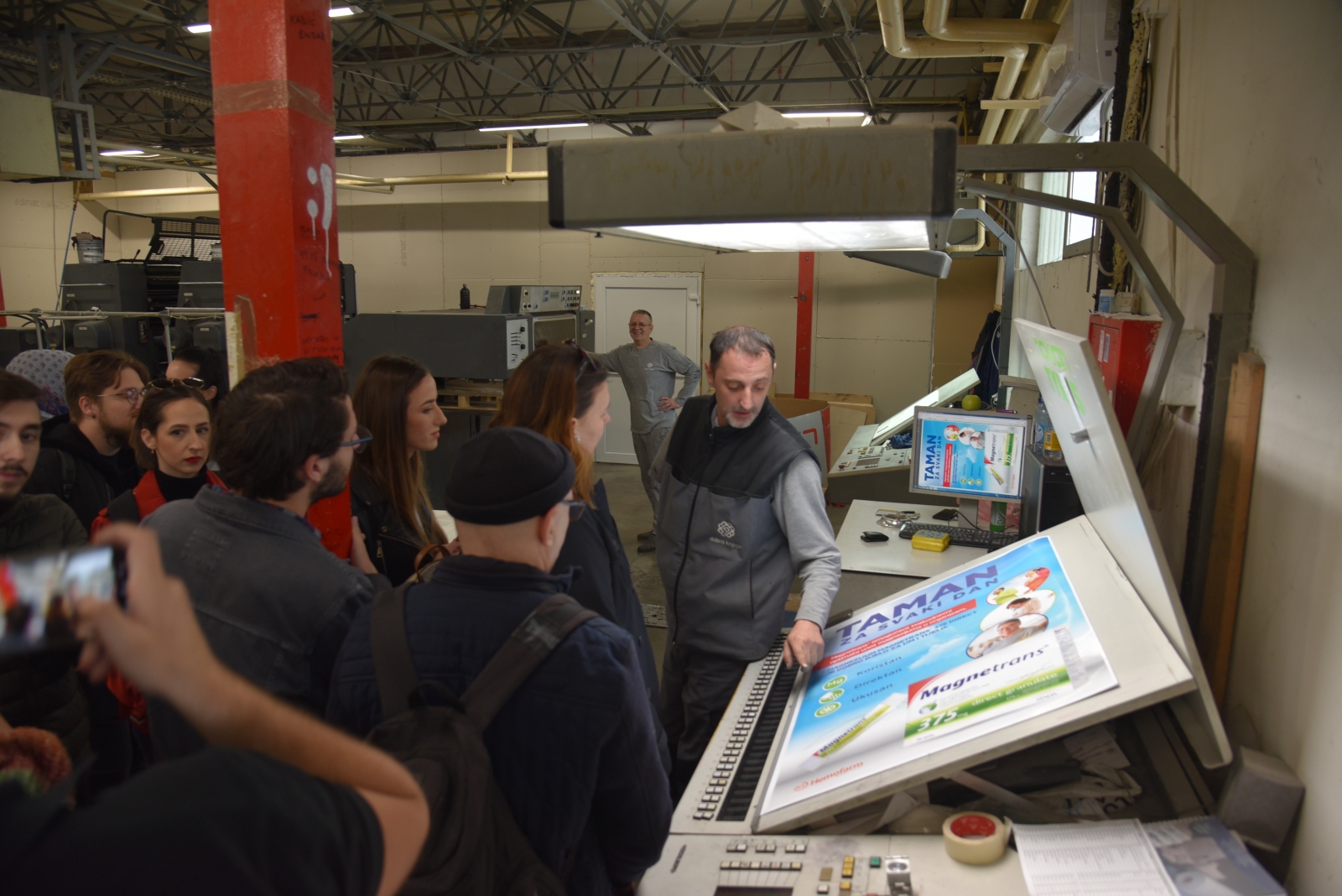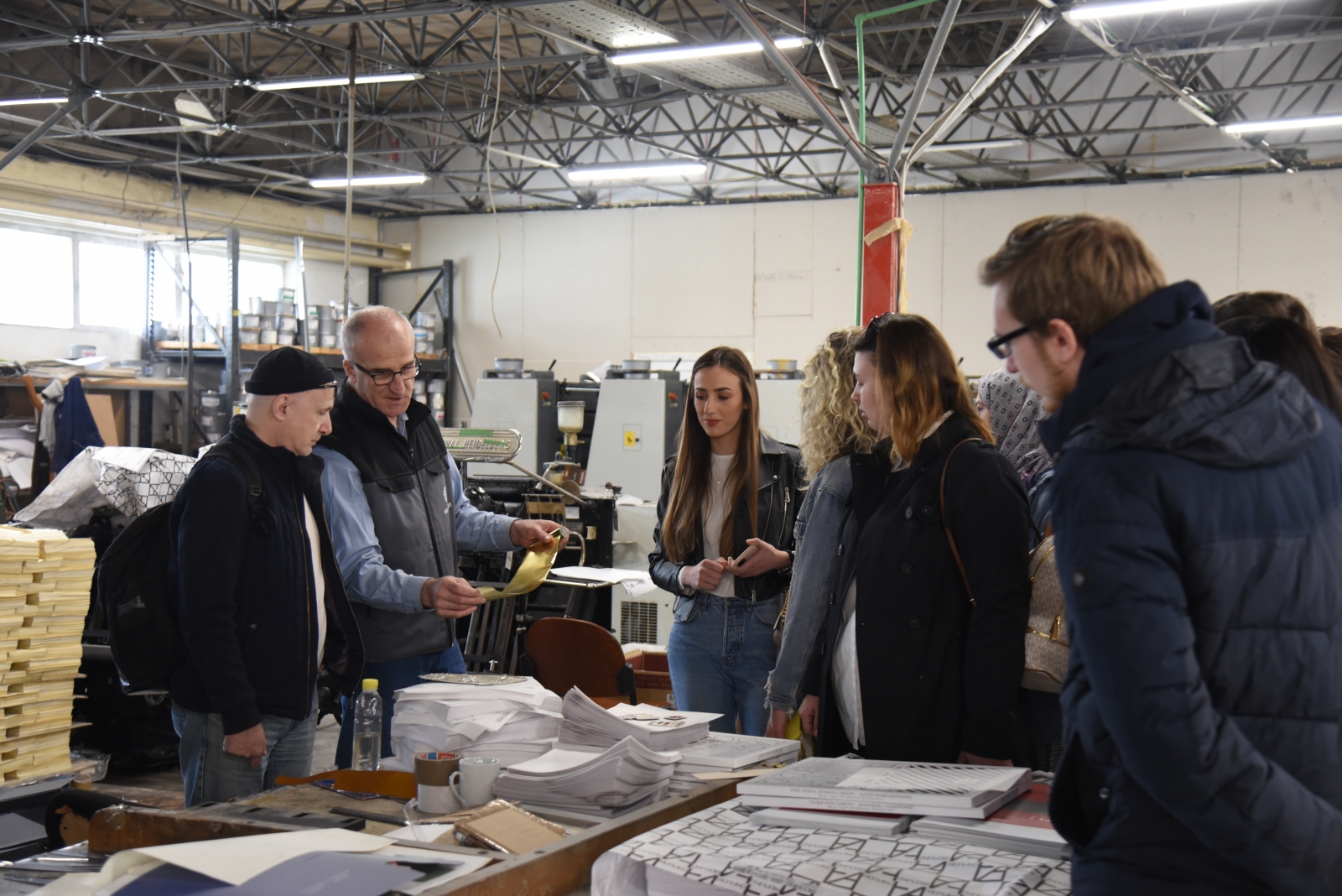 On March 28, 2022 Visual Arts and Visual Communications Design (VACD) program students within the scope of Design Studio 2 course (VA416) taught by Assistant Professor Emir Hambo, visited local printing company Dobra knjiga. Students had the opportunity to learn more about the entire process of printing, including familiarization with types of paper, binding types, finishing tactics and printing machines, for both offset and digital production. Visits such as this one are highly important for students since it gives them the opportunity to connect their education with the industry, improve their knowledge and experience and see first hand how the production process works.