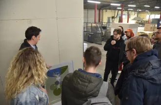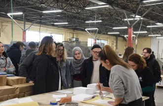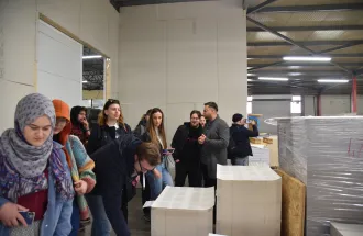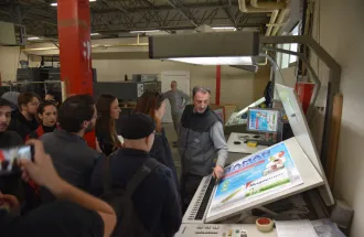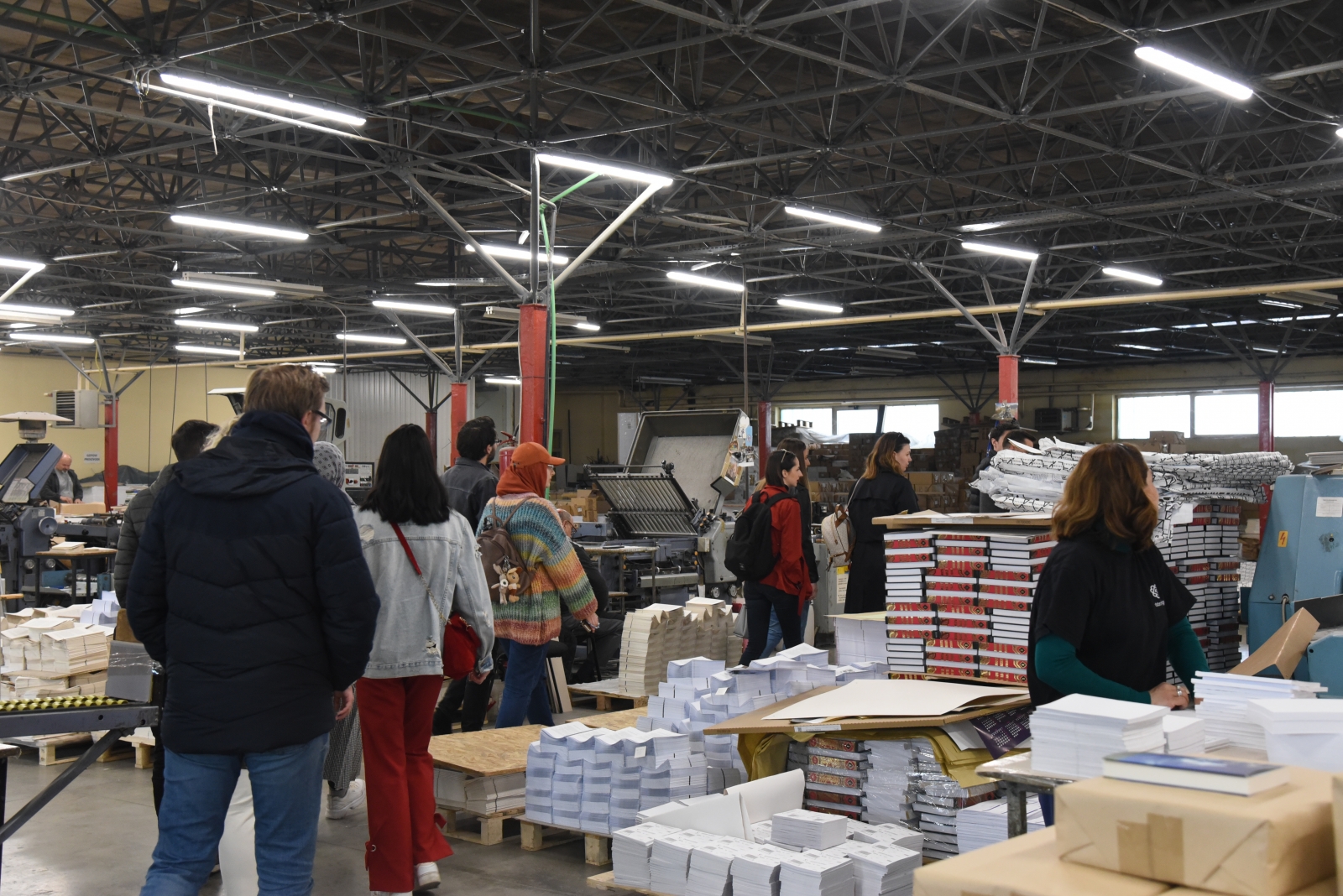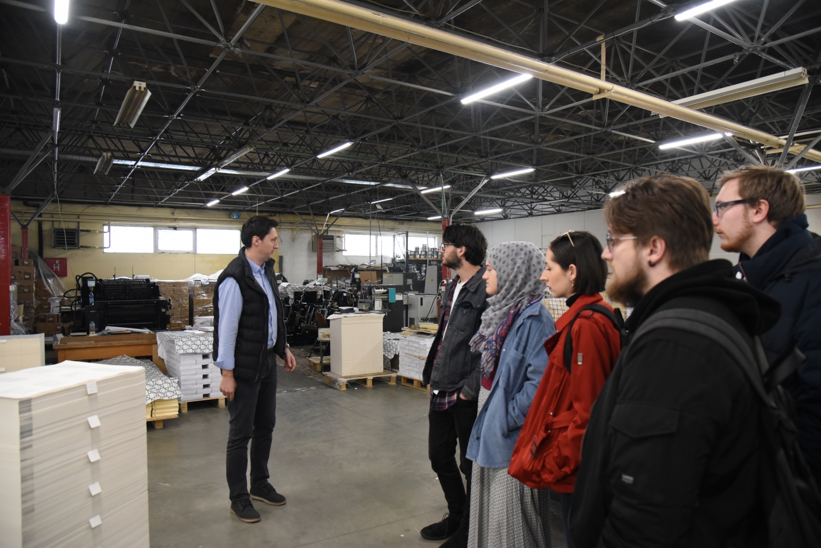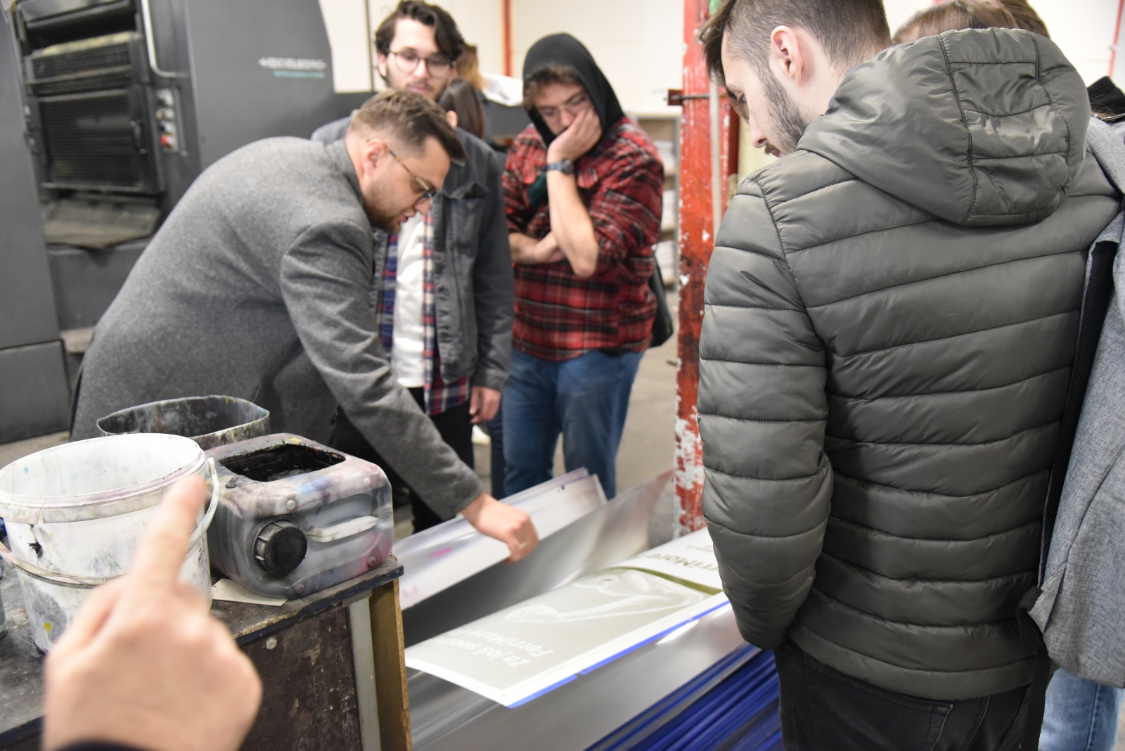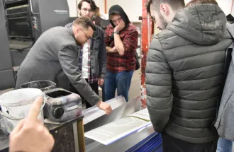 On March 28, 2022 Visual Arts and Visual Communications Design (VACD) program students within the scope of Design Studio 2 course (VA416) taught by Assistant Professor Emir Hambo, visited local printing company Dobra knjiga. Students had the opportunity to learn more about the entire process of printing, including familiarization with types of paper, binding types, finishing tactics and printing machines, for both offset and digital production. Visits such as this one are highly important for students since it gives them the opportunity to connect their education with the industry, improve their knowledge and experience and see first hand how the production process works.