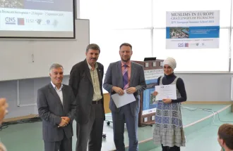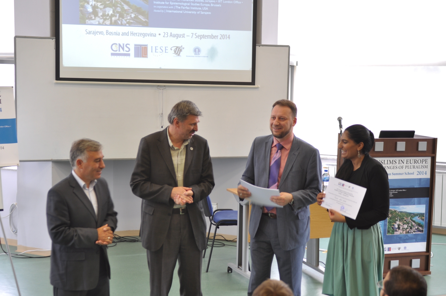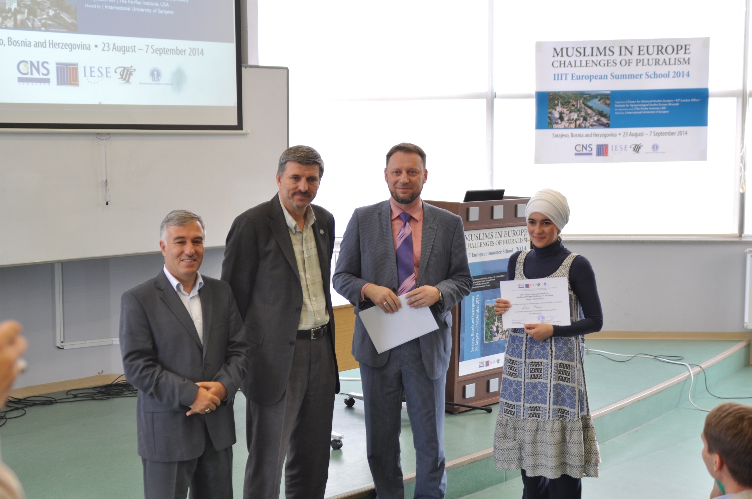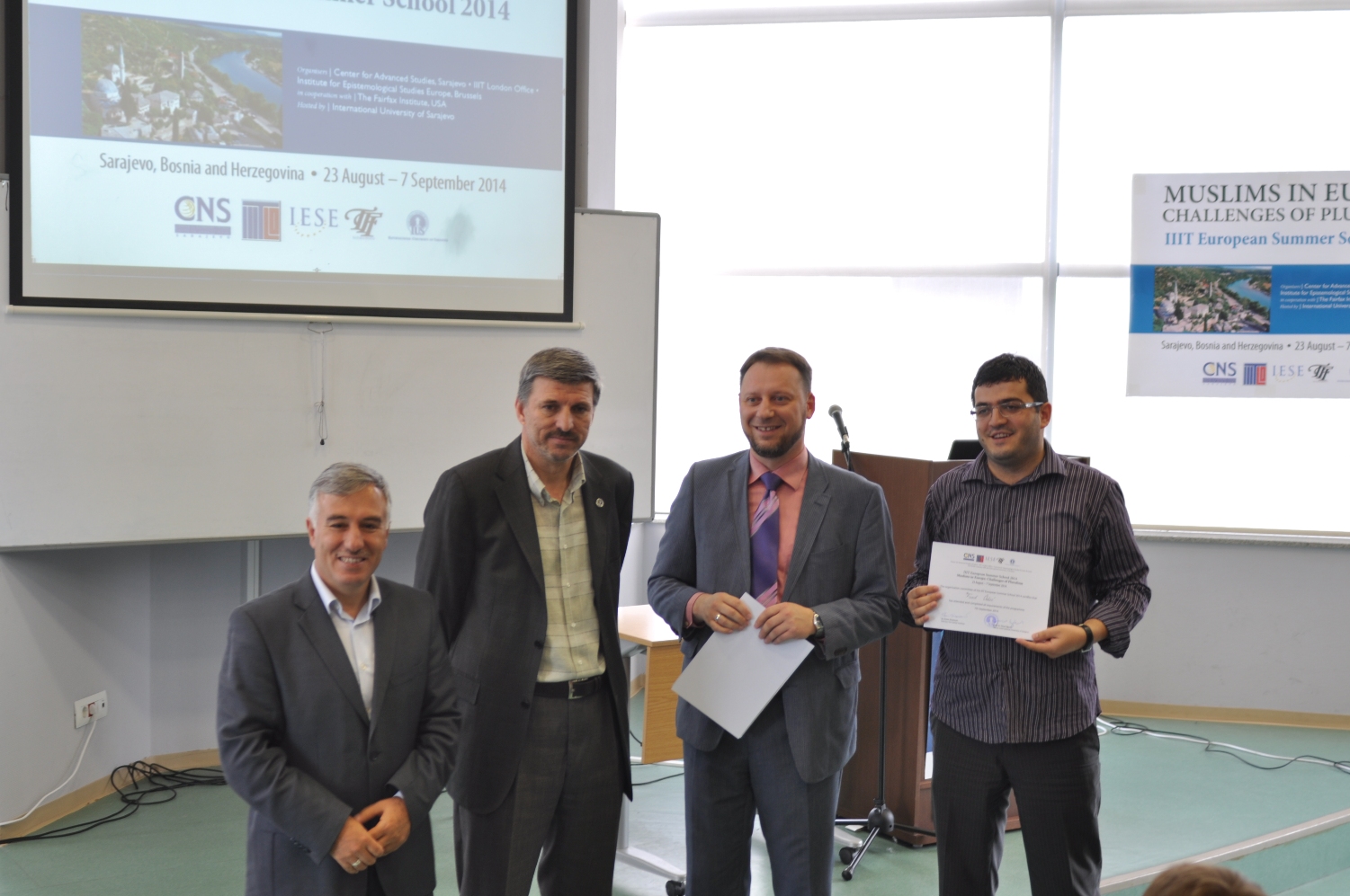 2014 IIIT Avrupa Yaz okulu Ödül törenine katılımcılar, konuşmacılar, yaz okulunu organize edenler ve IUS rektör danışmanı ve öğretim üyesi Doç. Dr. Hasan Korkut, IUS Mühendislik ve Doğa Bilimleri Fakültesi (FENS) Dekanı Prof. Dr. Fuat Gürcan ve diğer IUS idari temsilcileri katıldı. Katılımcılar sertifika ödüllerini Doç. Dr. Hasan Korkut, Prof. Dr. Fuat Gürcan ve Amerika Birleşik Devletleri (USA) Virjinya eyaletinde Uluslararası İslami Düşünce Enstitüsü Araştırma Enstitüsü ve Akademik Program yöneticisi Dr. Ermin Sinanović tarafından aldılar.