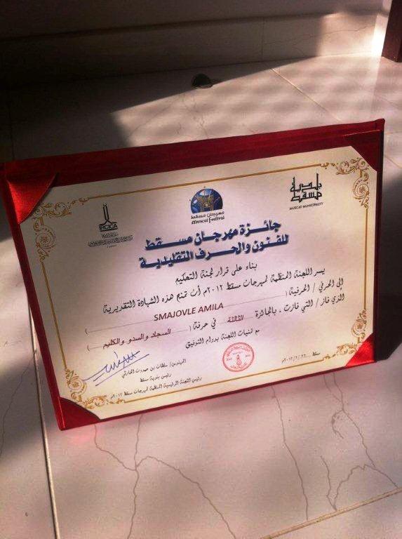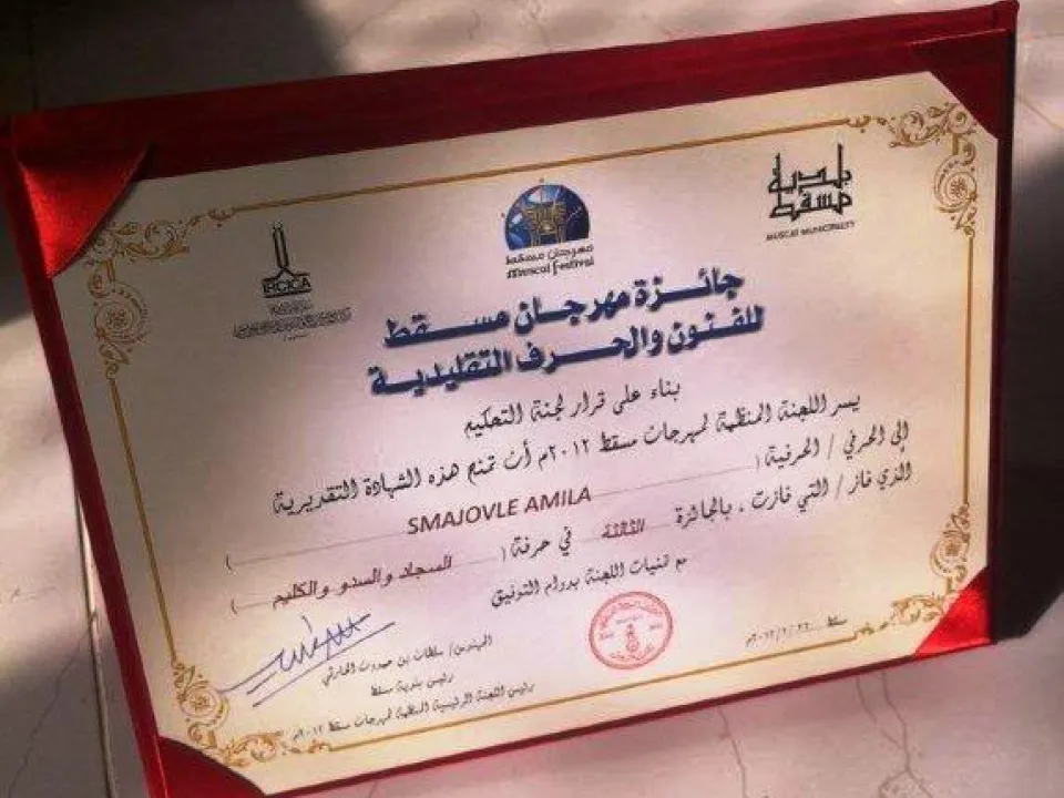 On 1 March , 2012, on the National day of Bosnia and Herzegovina, Assist. Prof. Amila Smajovic, won the prize for her artwork at International Exhibition for Arts, Heritage and Creativity in Muscat, Sultanat of Oman, under the high patronage of Engineer Sultan bin Hamdoon Harthy, Head of Muscat Municipality and Research Center for History, Art and Islamic Culture in Istanbul (IRCICA).Her tapestry will be permanently exhibited in Museum Bait al Baranda, in Muscat, Sultanat of Oman.