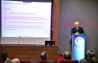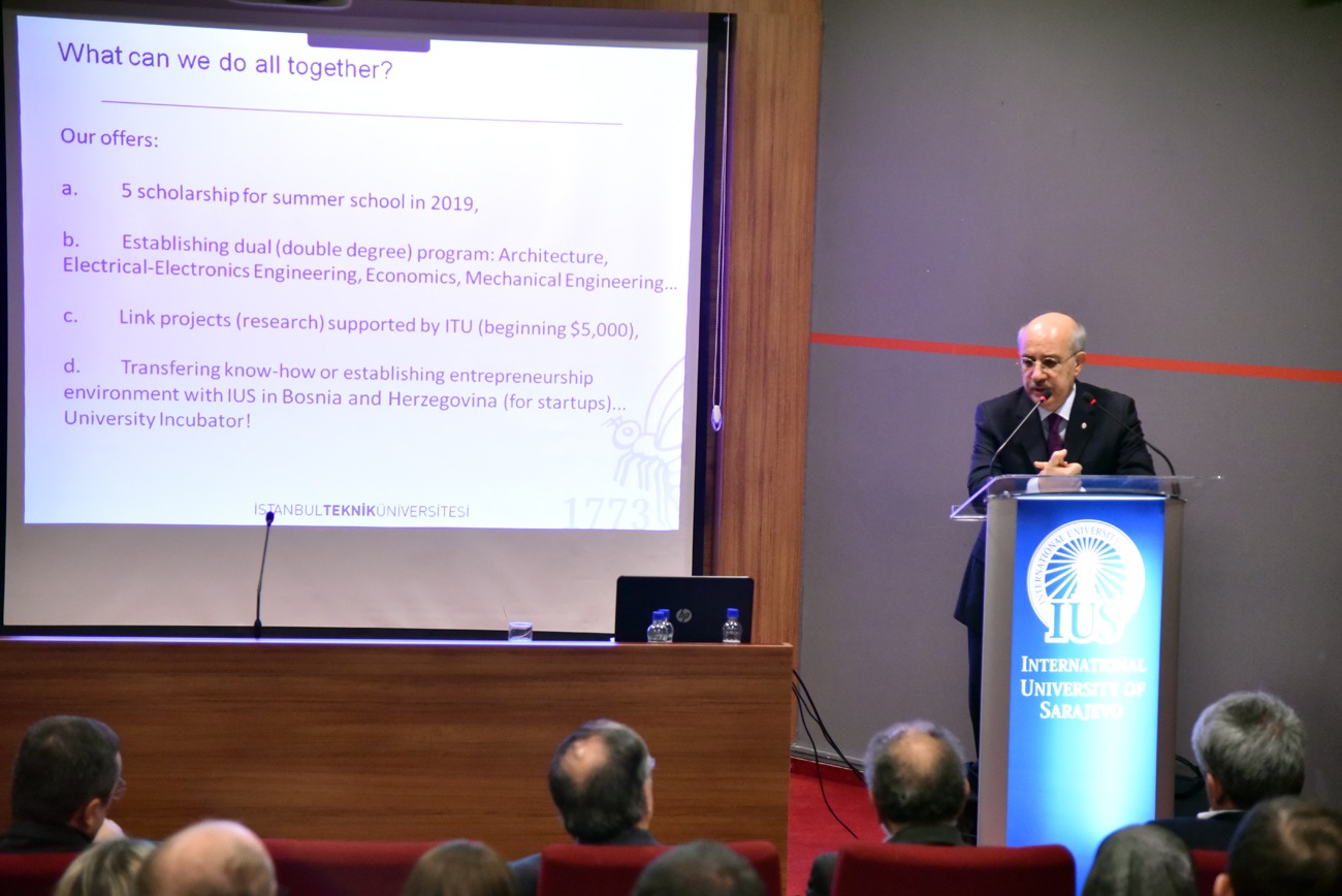 On January 22, 2019, Prof. Dr. Mehmet Karaca, Rector of Istanbul Technical University (ITU), gave a lecture for International University of Sarajevo (IUS) students and staff, titled: ”Universities in 21st Century”. He spoke about how universities have transformed since the 19th century, and revealed several excellent opportunities that IUS academic staff, students, and the university as a whole can benefit from. The opportunities are coming along with the dual diplomas between the IUS and ITU. The success of ongoing collaboration that includes dual diploma programs in electrical engineering, mechanical engineering, economics, and architecture, could also be a milestone for the future collaboration, too.