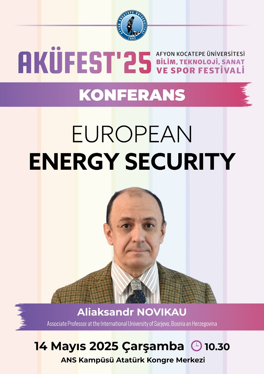14 Mayıs 2025 Çarşamba günü, IUS Siyaset Bilimi ve Uluslararası İlişkiler (PSIR) programı öğretim üyelerinden Doç. Dr. Aliaksandr Novikau, Afyon Kocatepe Üniversitesi'nde (AKÜ) "Avrupa Enerji Güvenliği" konulu bir konferans düzenlemiştir. Bu konferans, öğrencilere ve genis üniversite topluluğuna eğitim, kültür, sosyal ve eğlence fırsatları sunmak amacıyla düzenlenen AKÜ Bilim, Teknoloji, Sanat ve Spor Festivali (AKÜFEST'25) kapsamında gerçekleştirilen önemli etkinliklerden biri olmuştur.