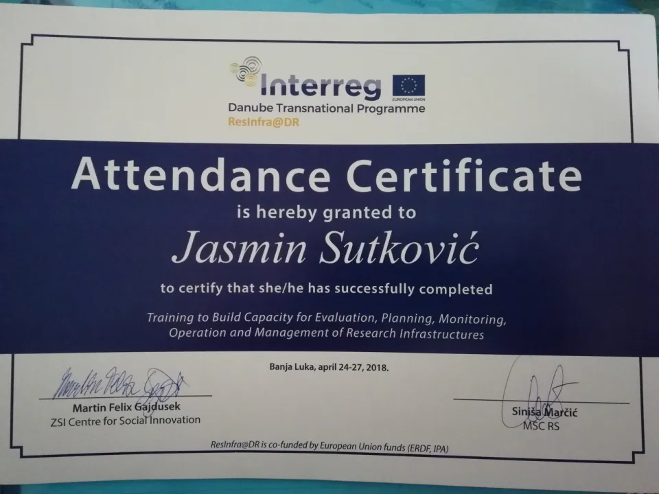 In April 2018 IUS senior assistant and vice manager of Research and Development center (RDC), Jasmin Sutkovic has obtained a certificate for Training To Build Capacity For Evaluation, Planning, Monitoring, Impact Steered Operation And Management Of Research Infrastructures, and in September this year he became a research infrastructure reviewer for the ResInfra@DR Registry in the Danube region countries. He received this membership among 355 applications from 34 different countries, whereas only 4 researches from BiH have been accepted.