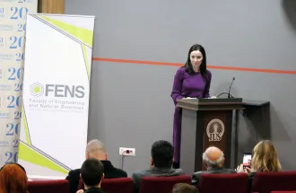 FENS Dekanı Doç Dr. Altijana Hromić-Jahjefendić tören sırasında öğrencilere, fakülte temsilcilerine ve program koordinatörlerine hitap etti. Konuşmasında, öğrencilerin başarılarından büyük gurur ve memnuniyet duyduğunu ifade ederek, özveri ve dayanıklılıklarını takdir etti. Öğrencileri üstün performanslarını sürdürmeleri ve kendi alanlarında uzmanlaşarak yenilik ve mükemmelliğin yolunu açmaları için çaba göstermeye devam etmeleri konusunda teşvik etti.