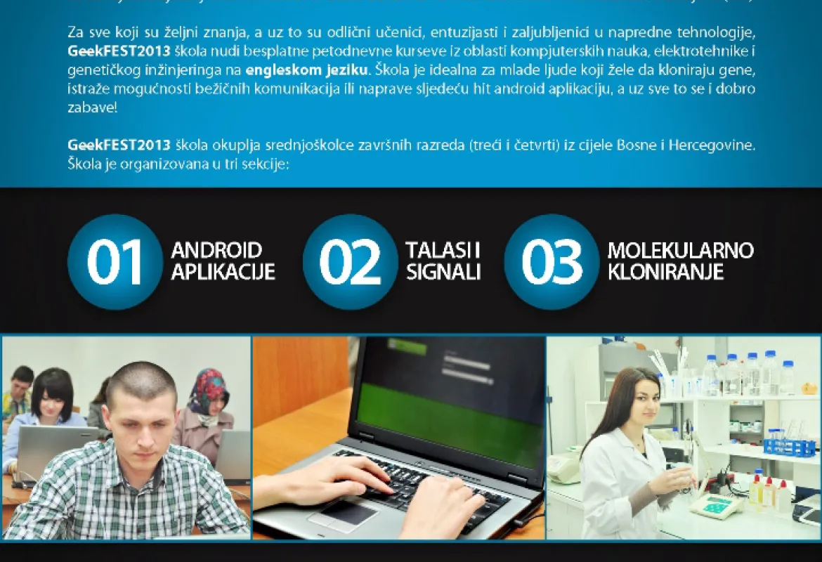 The aim of this school, is to bring high school students together from the 3rd and 4th grade, from all B&H, to attend a five-day program in one of the three technical disciplines presented (Molecular Cloning, Waves and Signals, Android Programming).